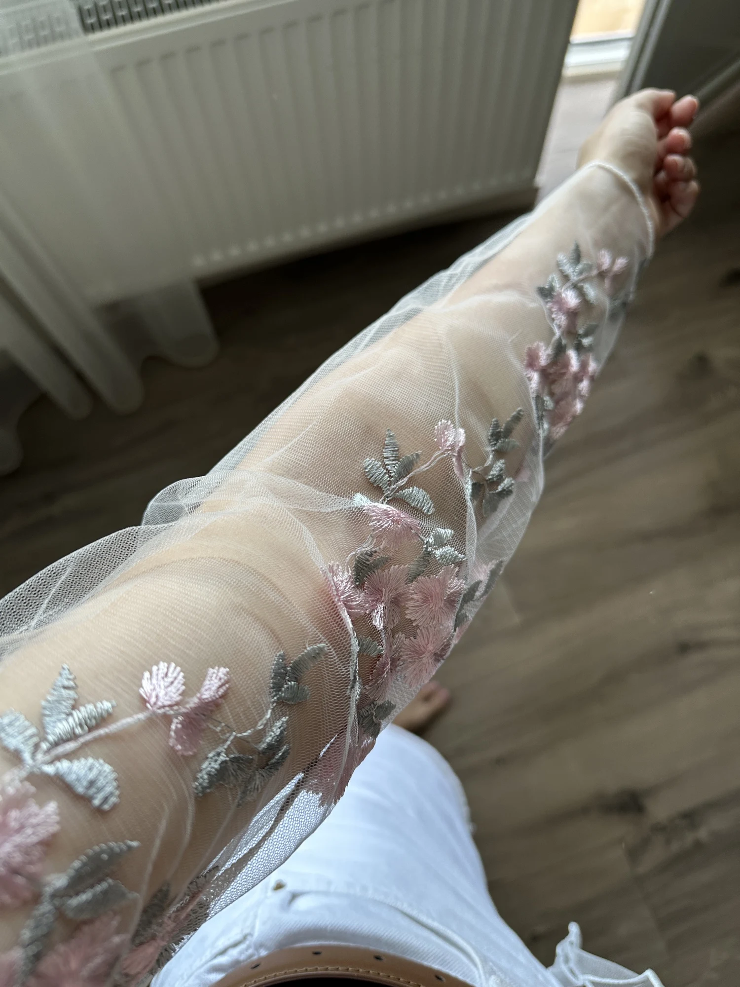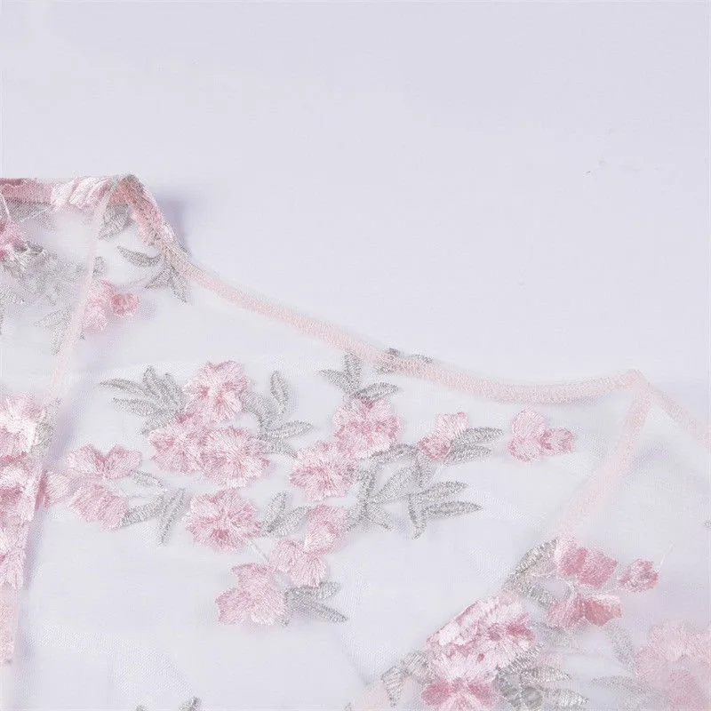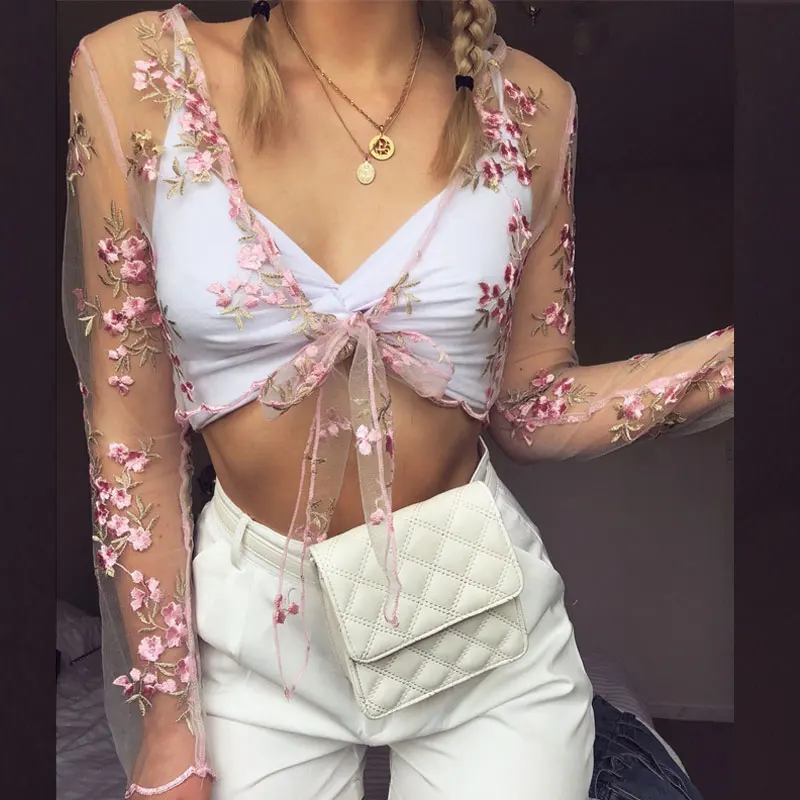 Женская прозрачная сетчатая укороченный топ с вышивкой с цветочным принтом, Летняя Повседневная Блузка с длинным рукавом и завязкой спереди