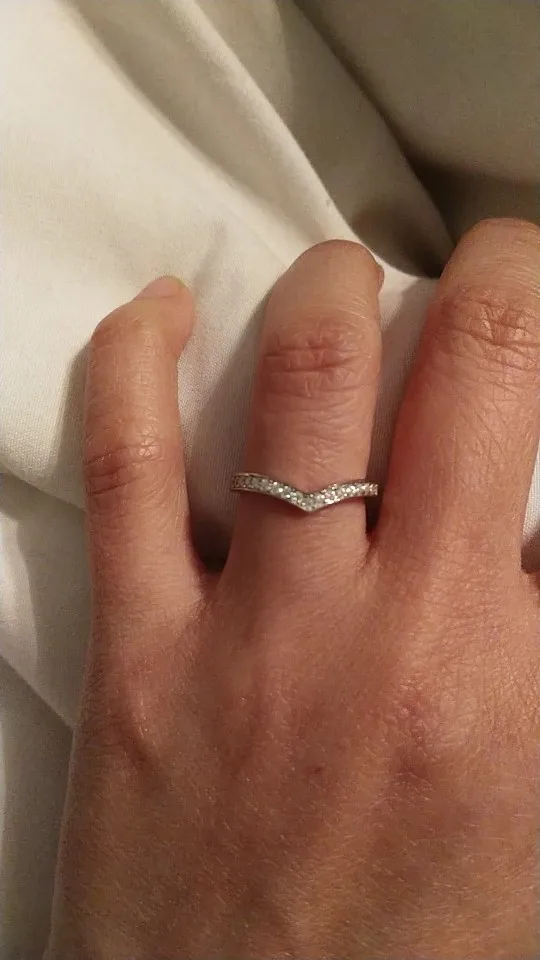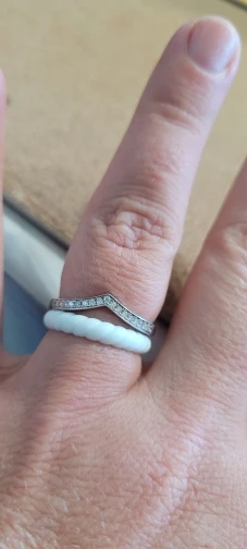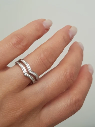 Мне нравится это кольцо, дизайнерские стеки идеально сочетаются с кольцом-пасьянсом или можно носить отдельно. Также выглядит милым, сложенным в несколько раз. Моиссанит сверкающий и красивый. Цена была отличной.