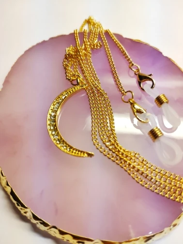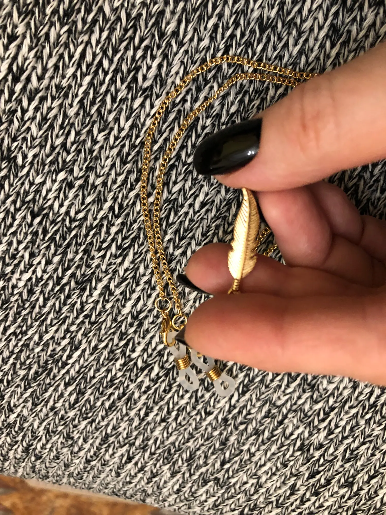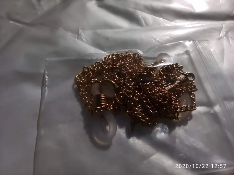 Доставили за 2,5 недели. Хорошая цепочка для очков, мне понравилась. Цвет желтого золота, гравировка на листике с обеих сторон, петли для дужек вменяемые (не хлипкие). С недавних пор полюбила цепочки для очков - очень удобно и очень практично.