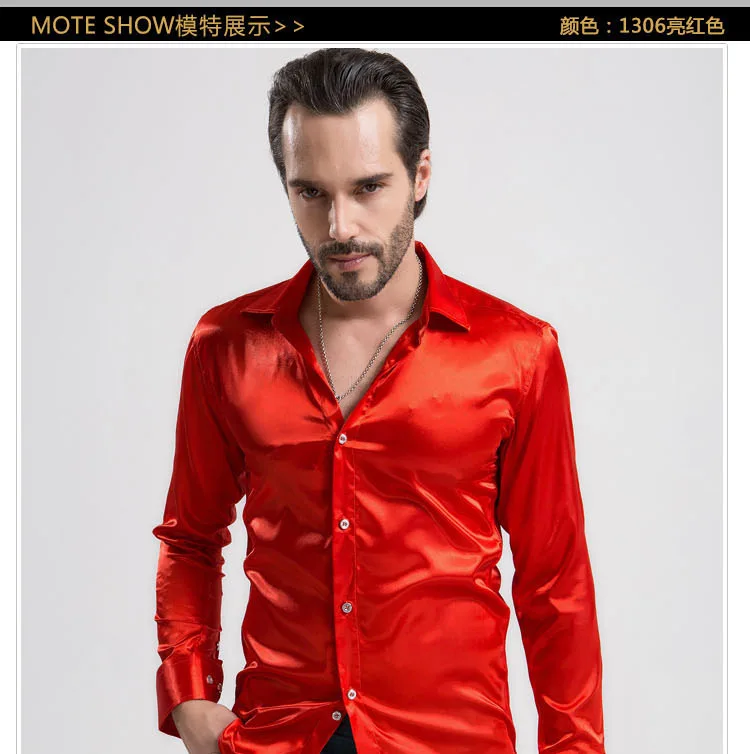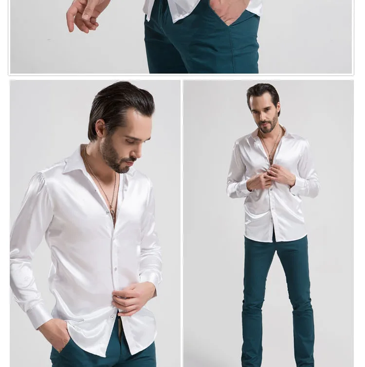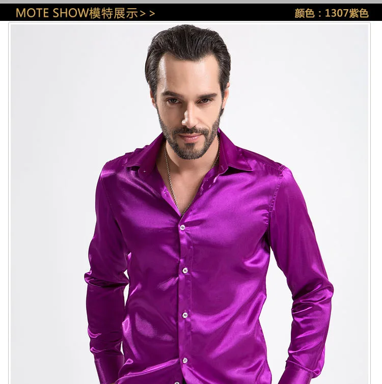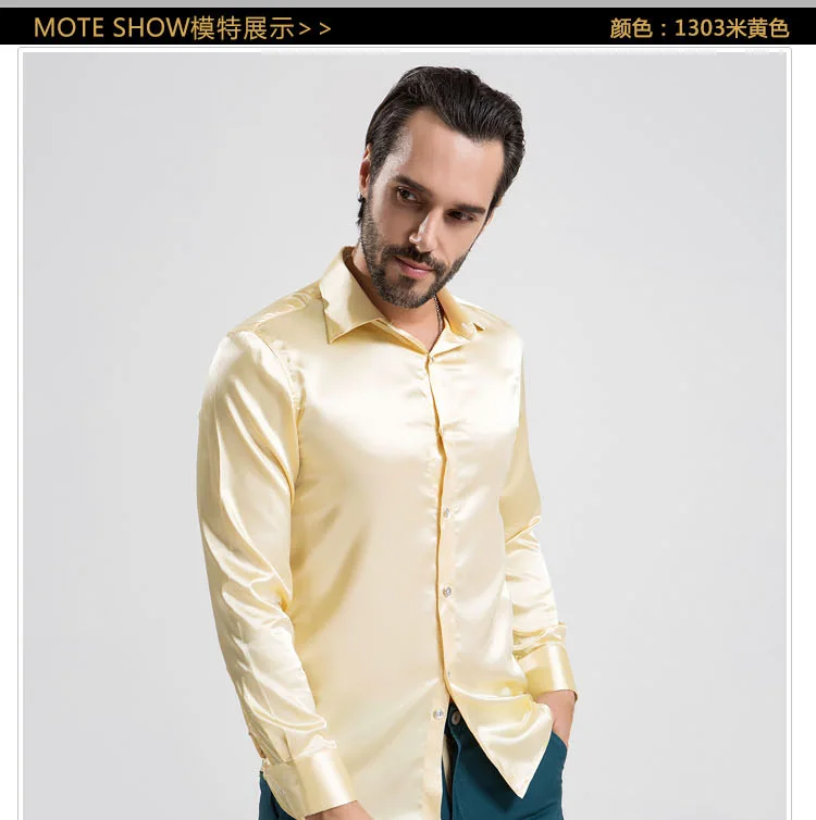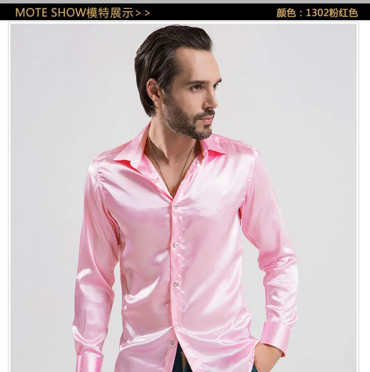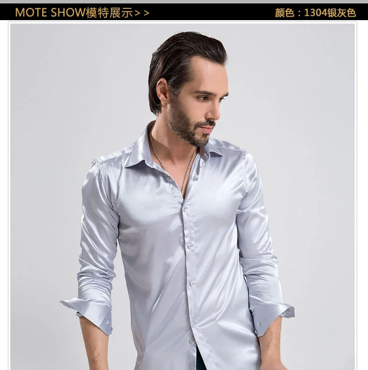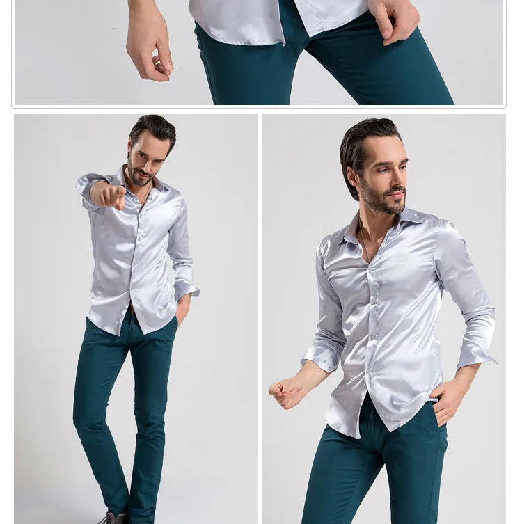 KH мужская мода блестящие Шелковистое атласное с длинным рукавом ру...