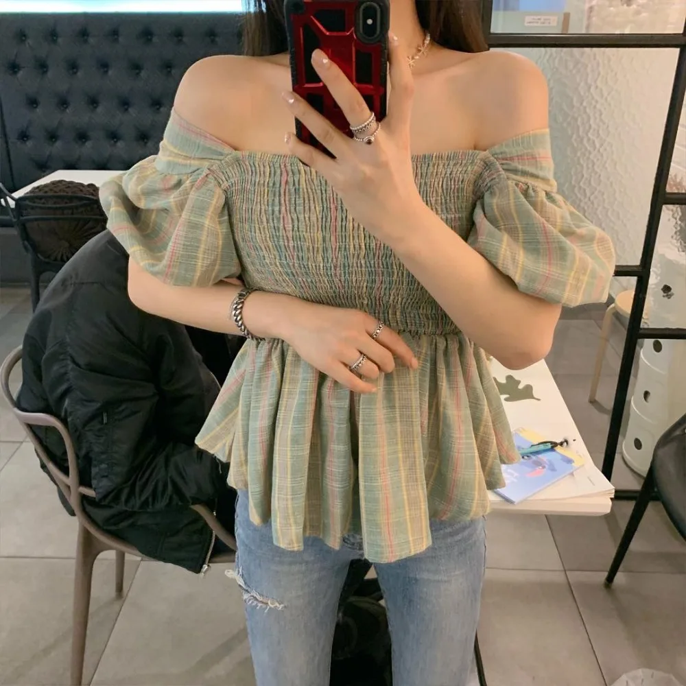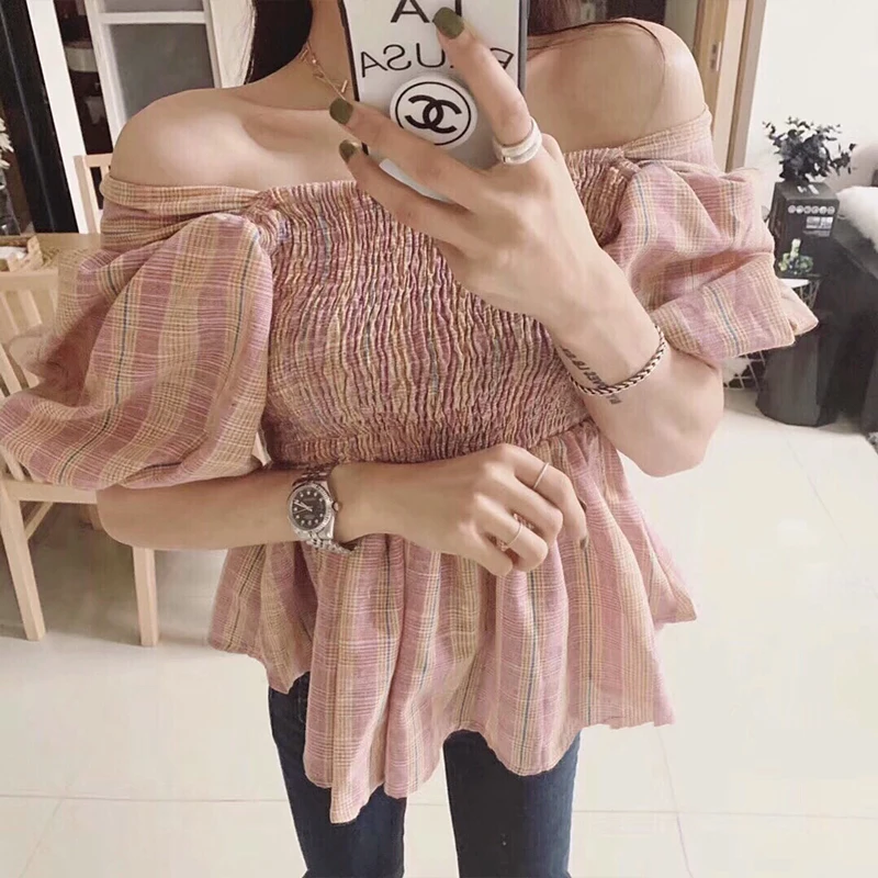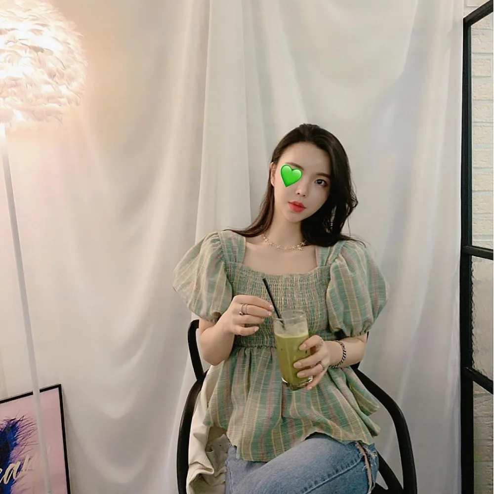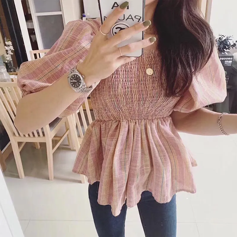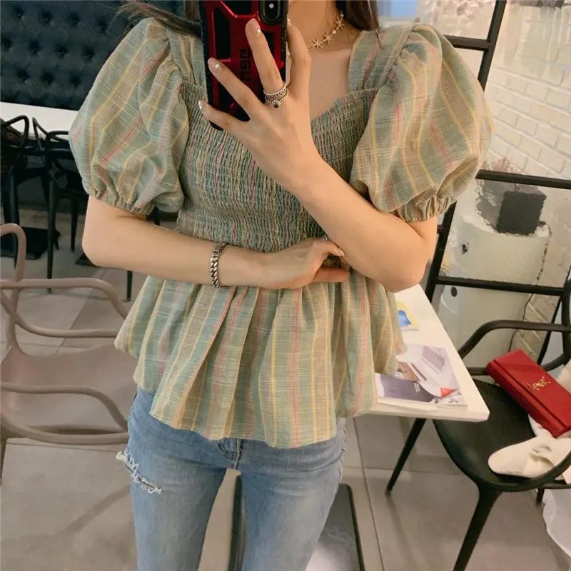 Блузка женская клетчатая с квадратным вырезом и рукавами-фонариками
