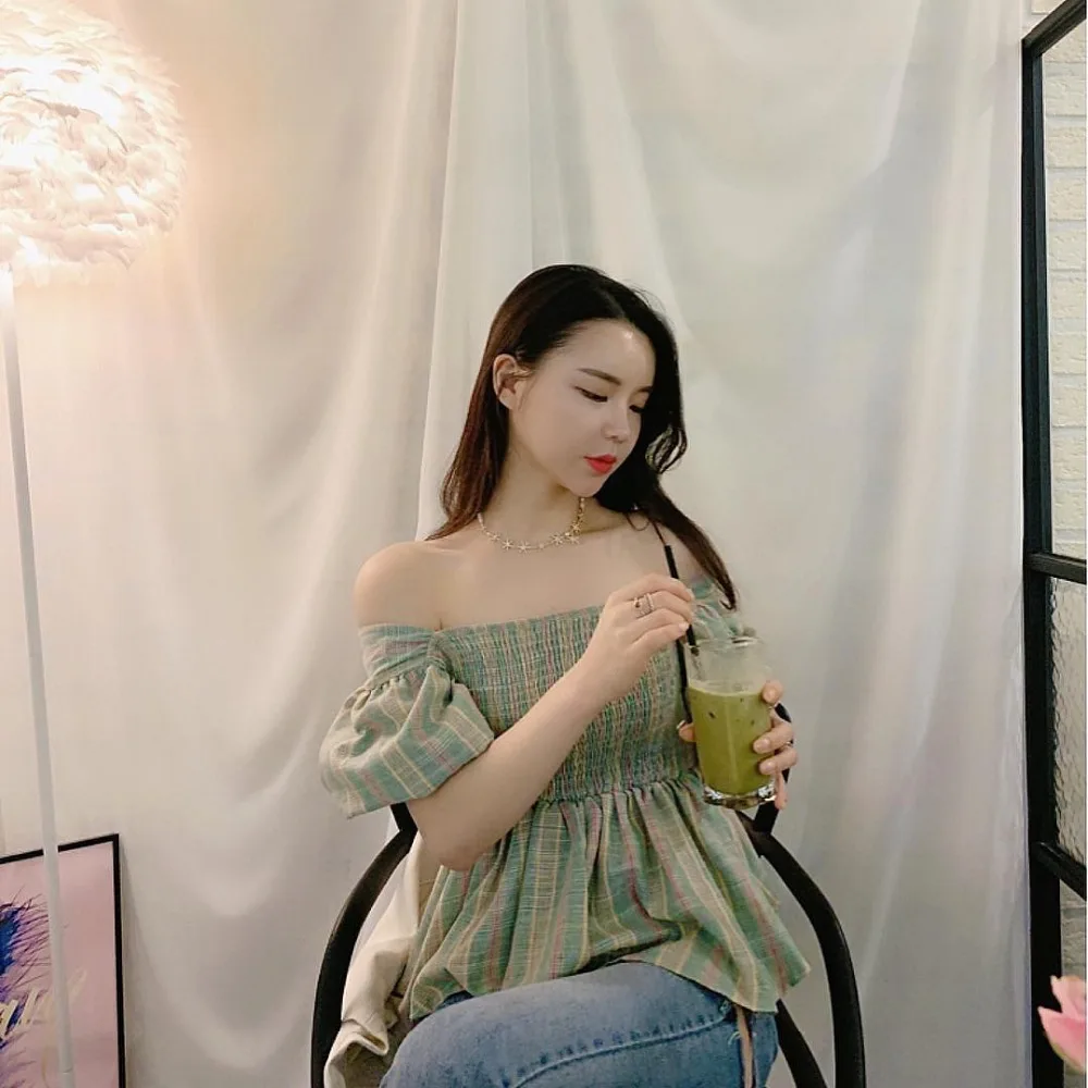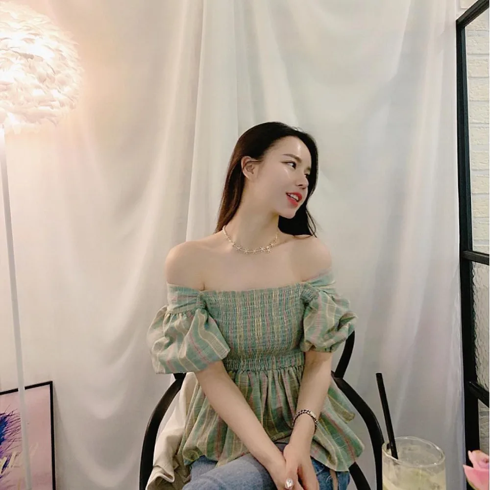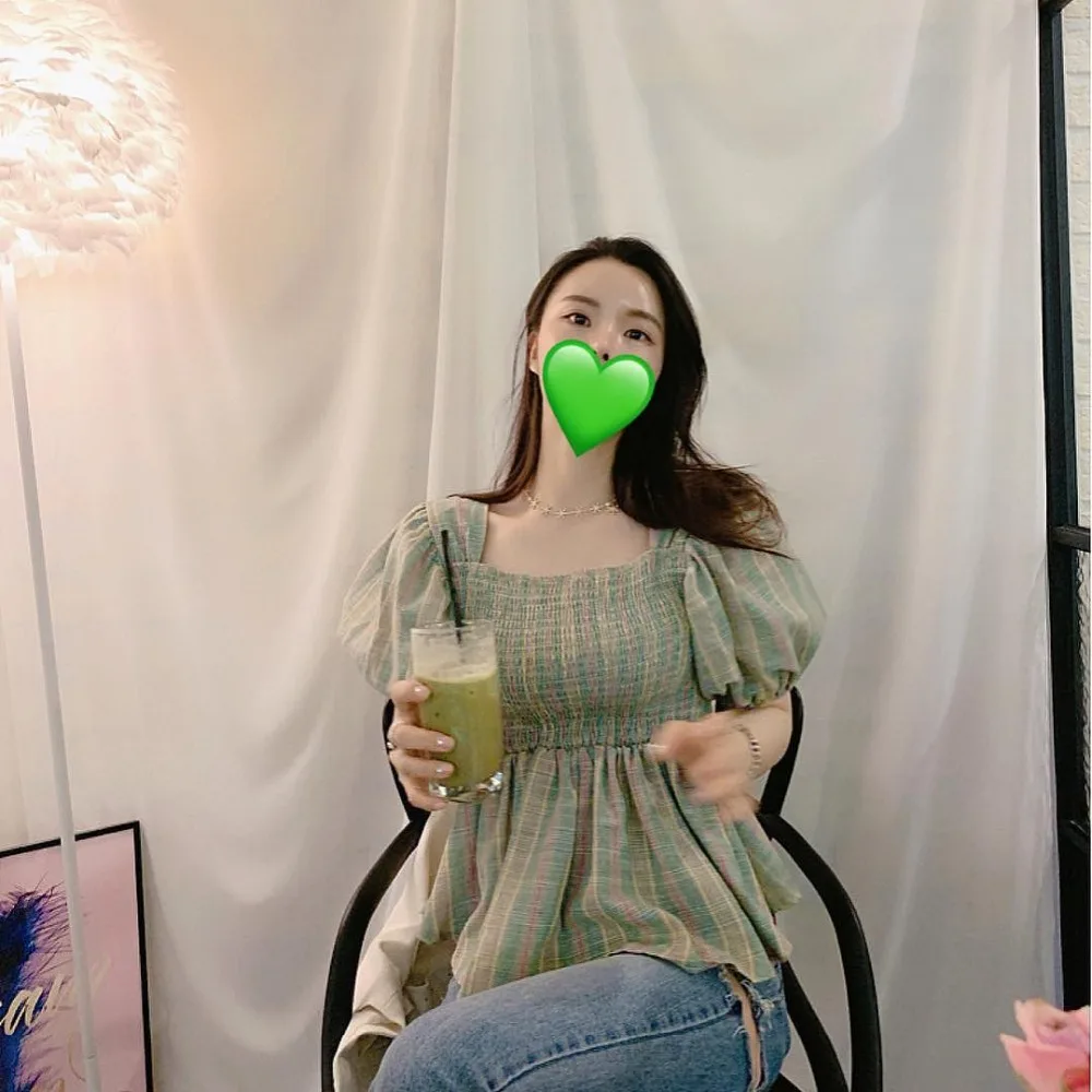 Блузка женская клетчатая с квадратным вырезом и рукавами-фонариками
