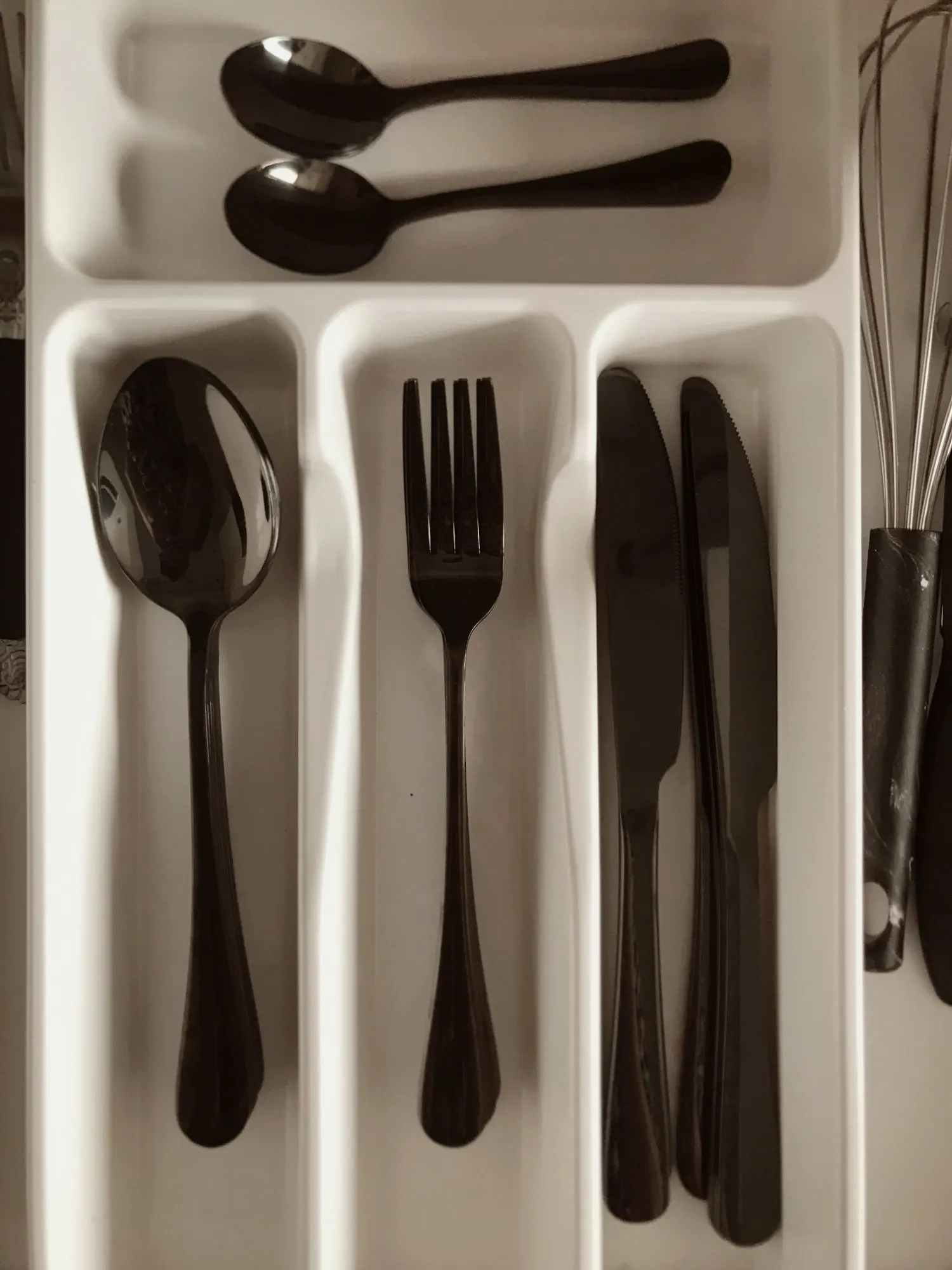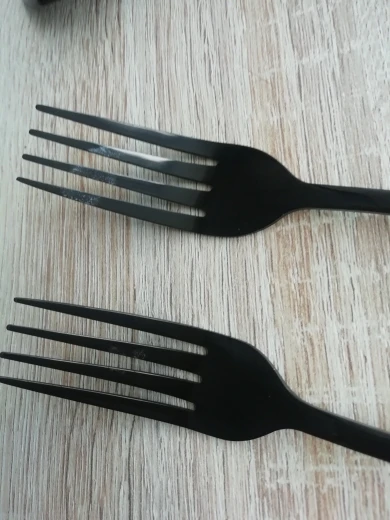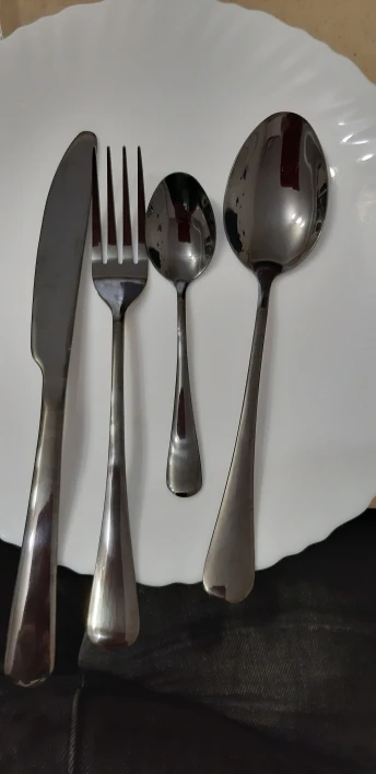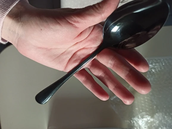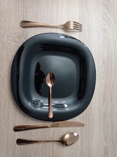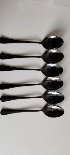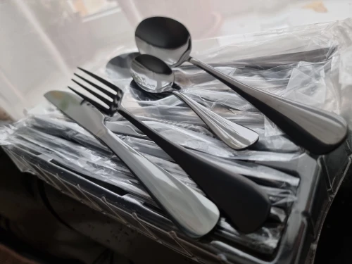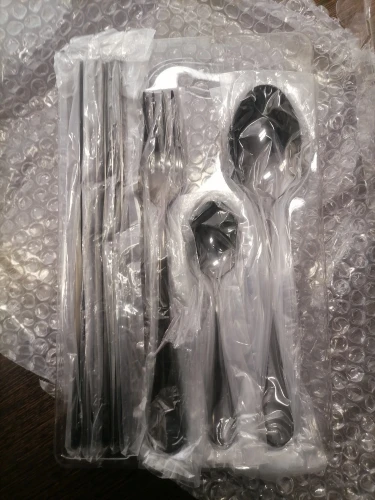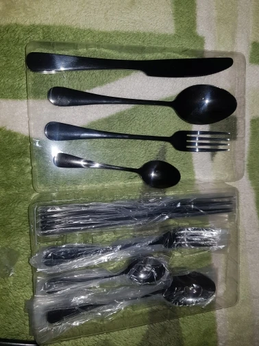 Всем привет!) Начнем небольшой обзор на набор столовых приборов. Цвет - хотела именно черные, т.к. белая кухня и все остальные принадлежности в ней черные. Муторно с мойкой, помыть и просто положить сохнуть в сторонку не получиться, придется сразу протирать и убирать в ящик, потому что вода испаряется и на ее месте остаются пятна. Если для кого-то это неудобно, не берите лучше. После каждой мойки не у каждого найдется время натирать посуду. Качество - не легкие, но и не тяжелые. Местами есть небольшие сколы, но не критично, это не бросается в глаза. На боках некоторых приборов есть неровности, не отшлифовали, наверное, тщательно. Форма - кушать удобно, никакого дискомфорта не вызвали при приеме пищи. Доставка быстрая, около недели компанией СДЭК. За свою цену - это хороший набор. В городе я не нашла именно черных приборов. Будем заказывать повторно, на случай гостей.
