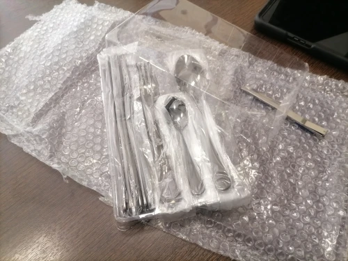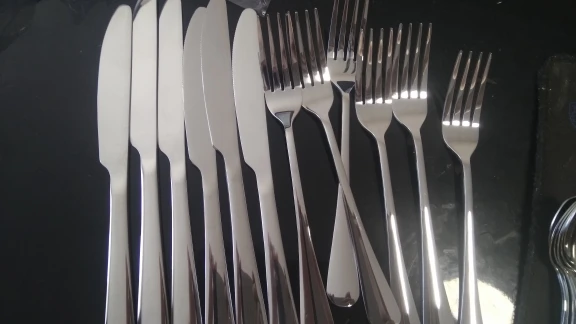 Набор пришёл достаточно быстро. Приборы глянцевые. Мне понравился, единственное за что снизила одну звезду, это то, что на некоторых приборках зазубрины, царапины, не сильные, но есть и края у приборов у ручки достаточно острые.