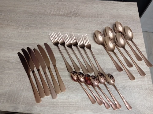 Отличного качества столовые приборы, в меру тяжёлые, на процессе приема пищи не сказывается. Выглядит богато, есть конечно небольшой косметический недостаток, но как по мне абсолютно некритичный - поверхность металла глянцевая и быстро заляпывается, но на привлекательности не сказывается