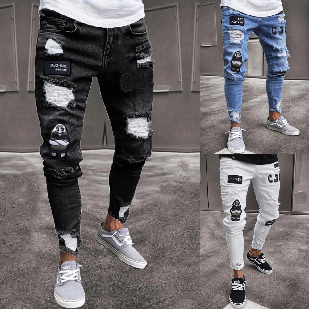 3 вида стилей, мужские эластичные рваные обтягивающие байкерские джинсы с вышивкой, рваные зауженные джинсы с потертостями, джинсы высокого качества с потертостями