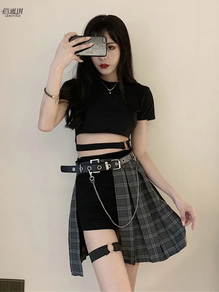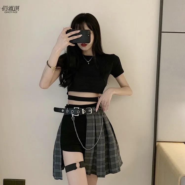Летняя клетчатая юбка с высокой талией и поясом, женские готические плиссированные юбки неправильной формы в стиле панк, женские модные ассиметричные юбки 2019