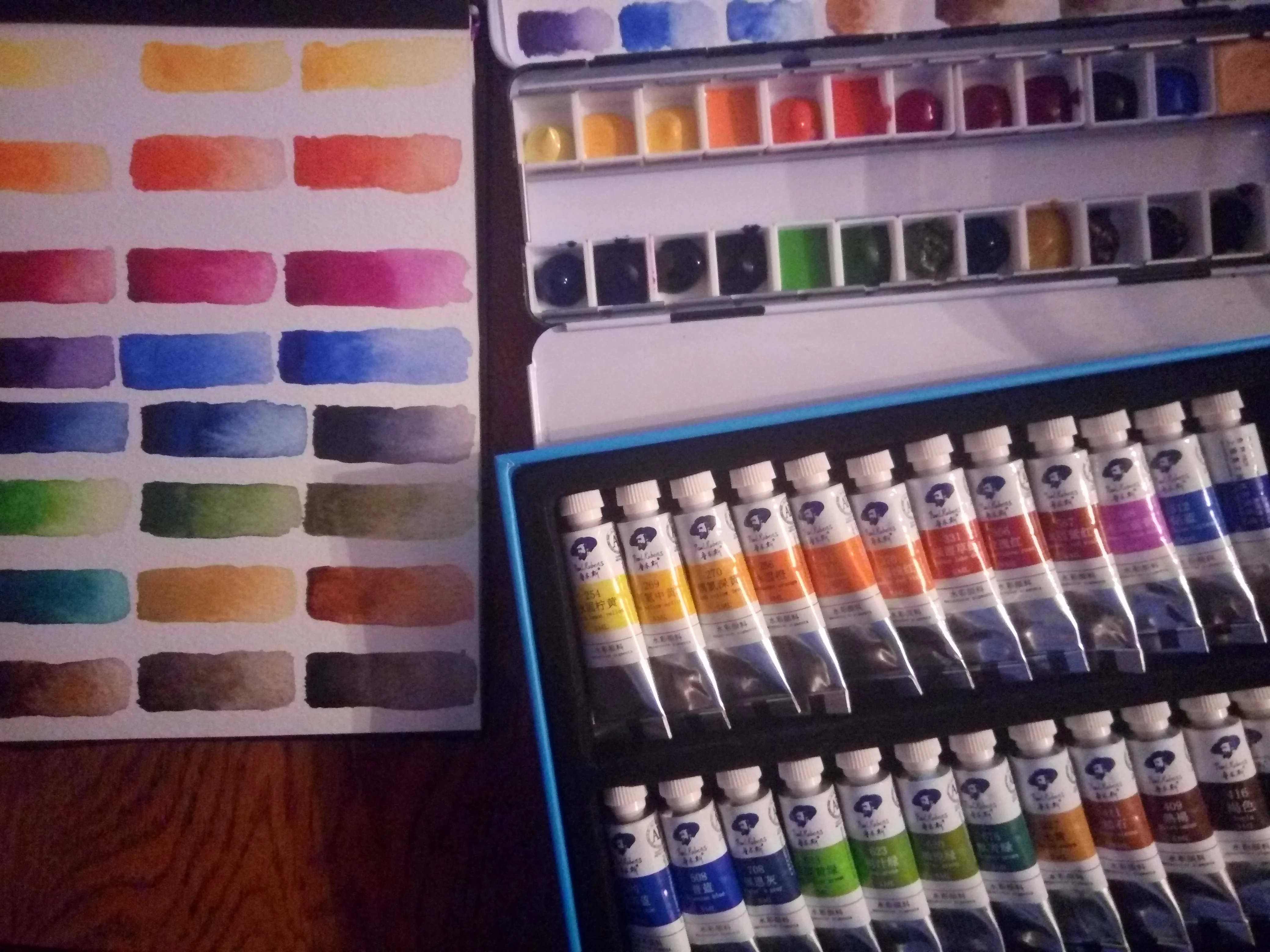 the colors come in really good conditions, and may not look exactly like those on the paper of the tube but have been pigmented right, also, it has colors like "Payne's gray" and "sepia" that normally don't come in more common watercolors packs so that was a happy surprise, to find colors I didn't have before. in the image I have tried the colors first and then painted a sketch whit them. Payne's gray was used for the skin's shadows and sepia for the mask.