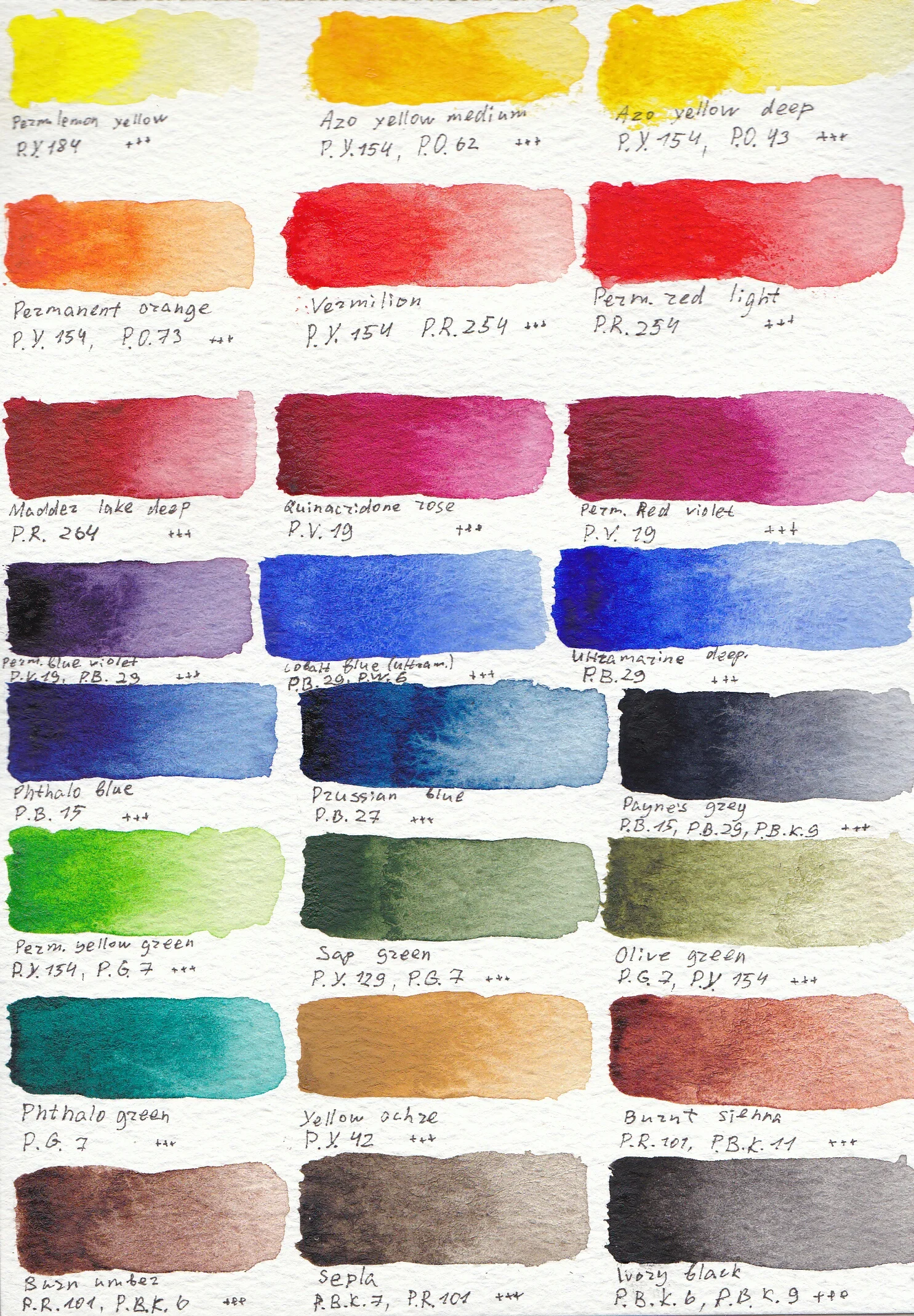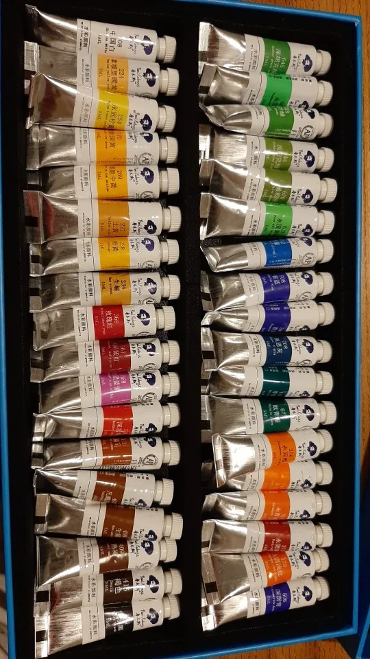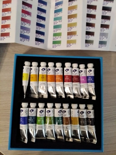 Замечательные краски. Чувствуются не хуже Белых Ночей. Тубы хватит чтобы заполнить целую кювету (или две полукюветы). Цвета яркие и чистые, богатая палитра покроет любые нужды в иллюстрации. Несколько цветов имеют небольшую грануляцию - оливковый чуть заметно распадается на зеленый и охру, perm. blue violet на синий и розовый, серая пейна на серый и синий, у этой краски эффект самый ярко выраженный. Смеси чистые и предсказуемые. Коробка очень плотная и добротная, на каждой тубе есть информация о пигментном составе и светостойкости. Не все цвета тюбиков совпадают с настоящими. Моя выкраска точно передает настоящие оттенки. Доставка долгая, но того стоит. Цена за подобное качество невероятно приятная.
