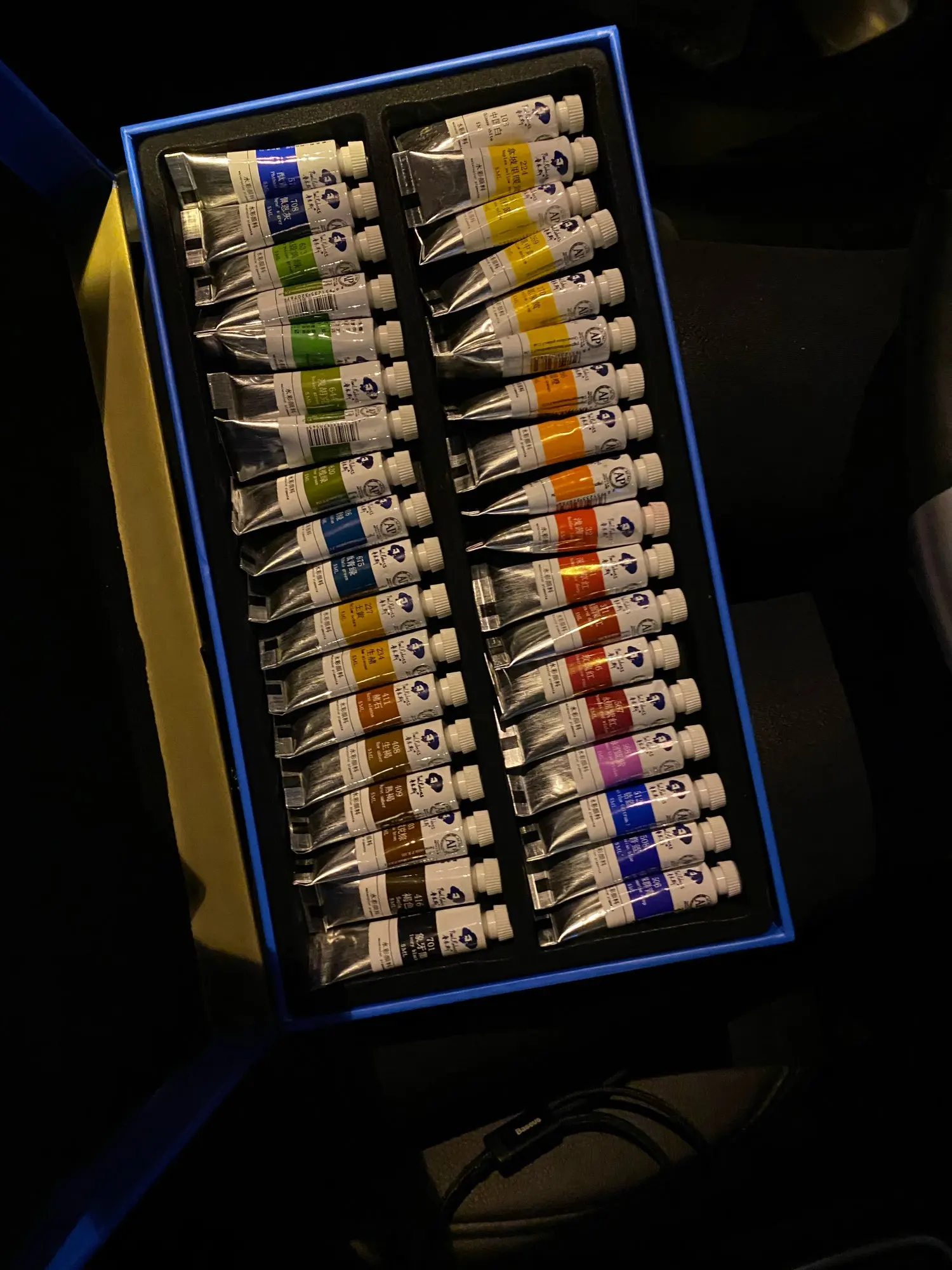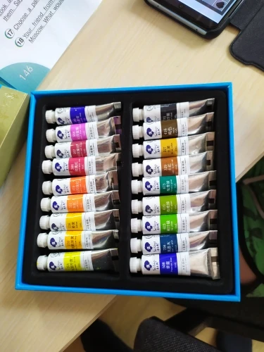 это просто восторг, так красиво всё упаковано, очень красивая коробочка и такие красивые тюбики, на фото мне они казались больше, вживую небольшие, но за такую цену это и так очень выгодно, можно брать набор на подарок, он просто очень очень хорош, я так и сделала - это подарок мне на новый год, себя тоже иногда надо баловать) я в восторге, большое спасибо)у меня он со скидкой вышел 1500р, в деле пока краски не пробовала) продавец в подарок положил губку чтобы промакивать кисть от лишней влаги, это просто любовь, добавлю магазин в подписки