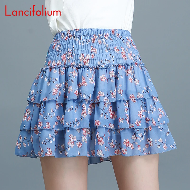Мини-юбка женская шифоновая с цветочным принтом, милая многоярусная школьная плиссированная юбка-трапеция в Корейском стиле, с эластичным завышенным поясом, черная белая, B006