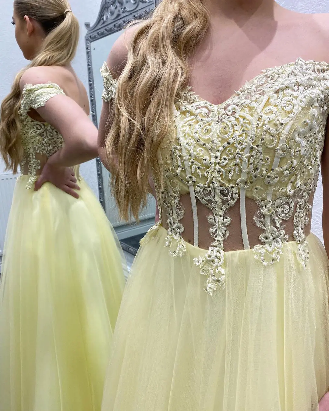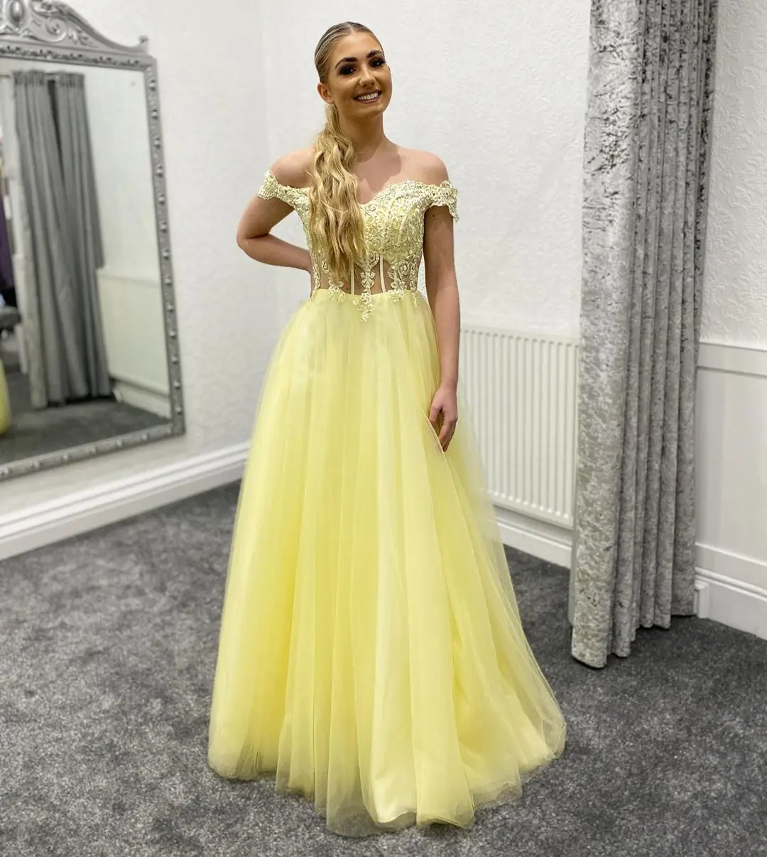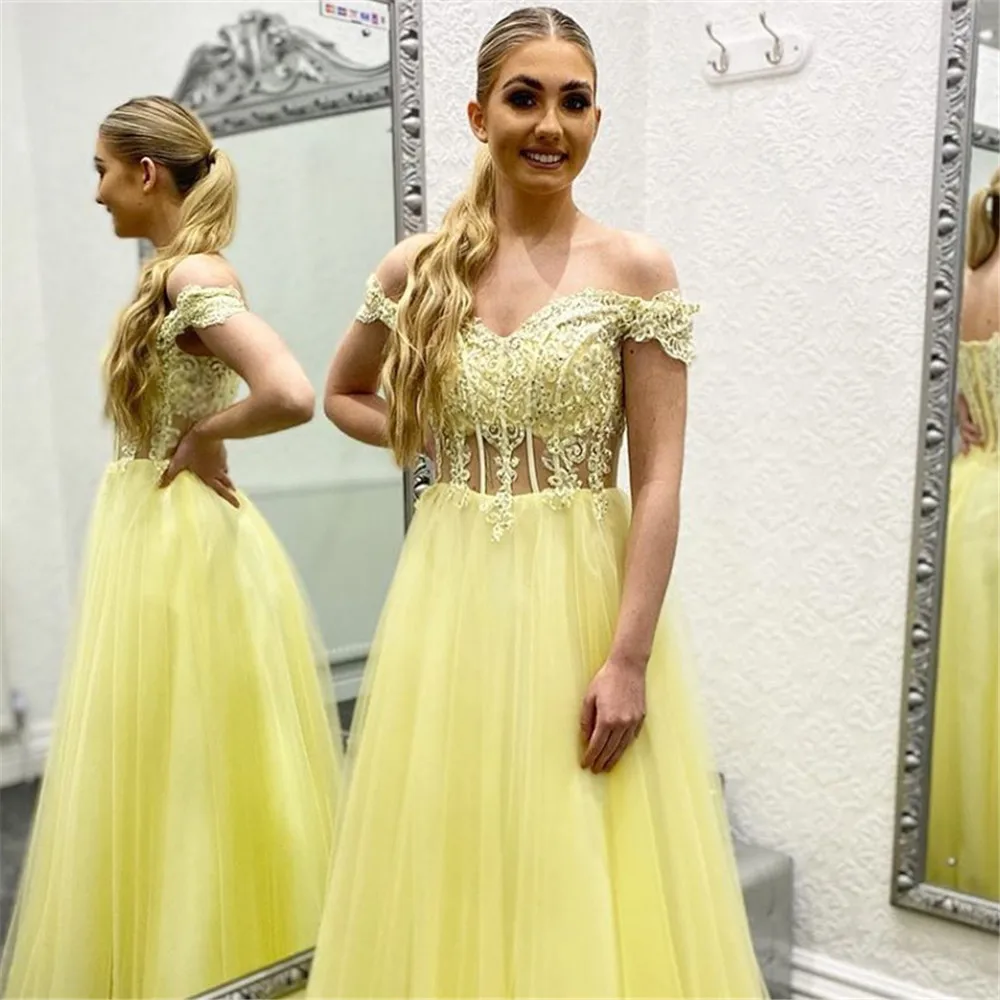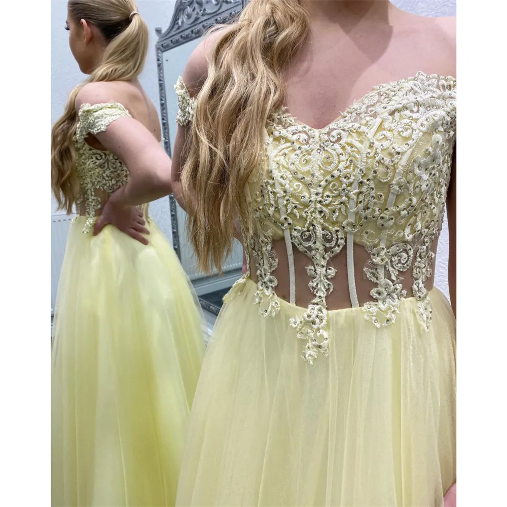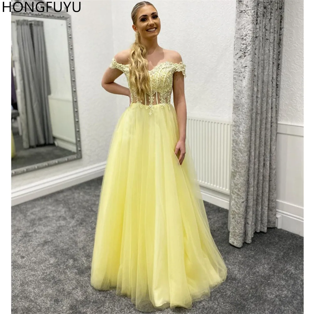 Желтое шифоновое вечернее платье HONGFUYU, с открытыми плечами, для выпускного вечера, с длинными аппликациями, со стразами