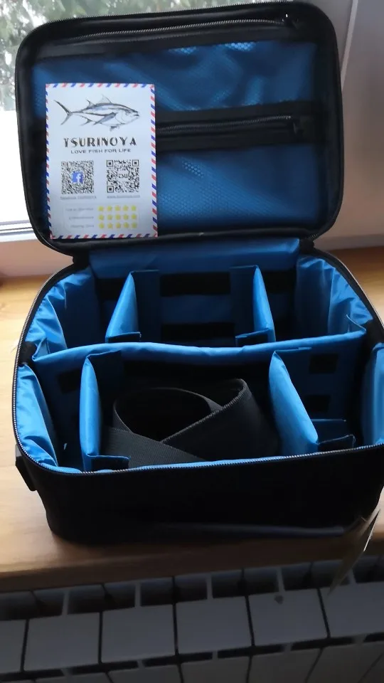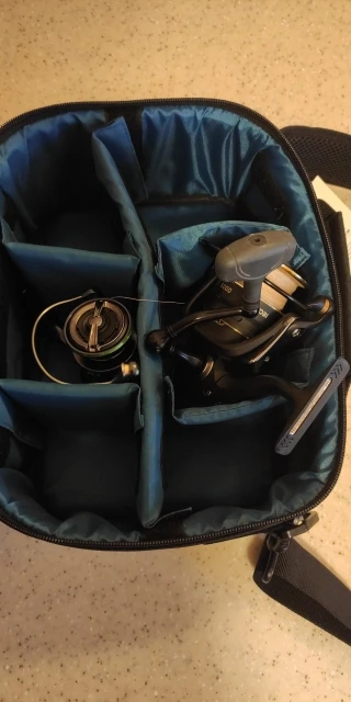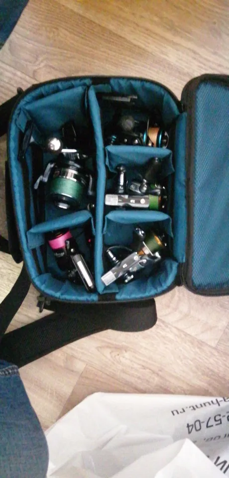 Хорошая сумка. Качественное исполнение. На фото в сумке лежит катушка размером 2500 и 5000. Думаю 5000 четыре штуки влезут. На крышке два отделения под молниями, можно сложить ручки от катушек. Рекомендую. Доставка не быстрая, но может это из-за 11 ноября.