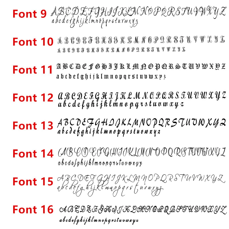3.Внимание: друг, после того, как вы разместили заказ. Пожалуйста, пришлите нам имя, которое вы хотите настроить. И выберите тип шрифта, который вам нравится. (Например: Jenny, шрифт 5.)Если вы не предлагаете Тип шрифта, мы будем использоватьШрифт по умолчанию. Пожалуйста, знайте это.