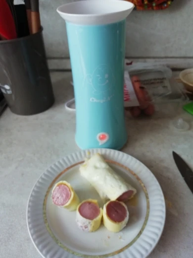 Понравился прибор, и вкусно и сытно).1 яйцо + 1 стандартная сосиска и все ок. Первый раз пробовали и с длинными и с обычными сосисками, результат на фото. Очень легко и удобно, детям постарше для самостоятельного использования самое то. Пришёл быстро в пятерочку, без коробки, просто в пупырке, переходник в комплекте.