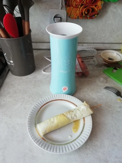 Отличный девайс, всё получилось с первого раза, сверху немного не пропеклось, сосиска была короткая, попробуем ещё с другой, готовится быстро. Заказ пришёл быстро, один минус - палочка для масла сломана, тк упаковано было только в мягкую плёнку без коробки.