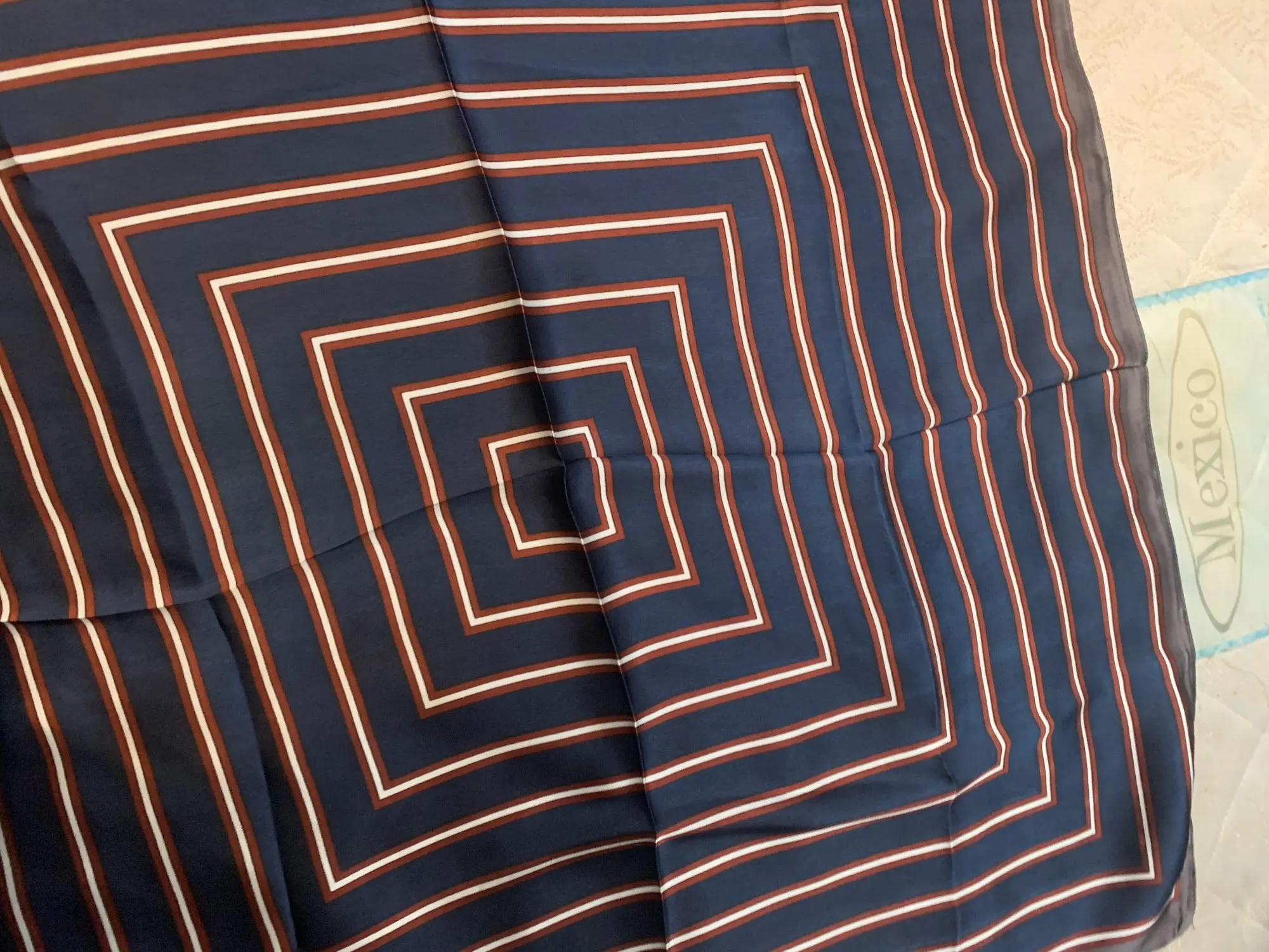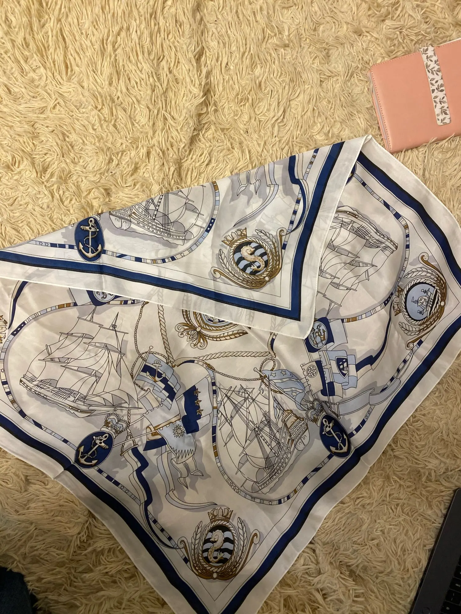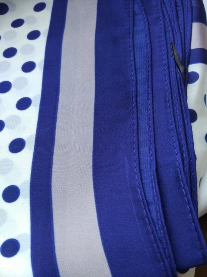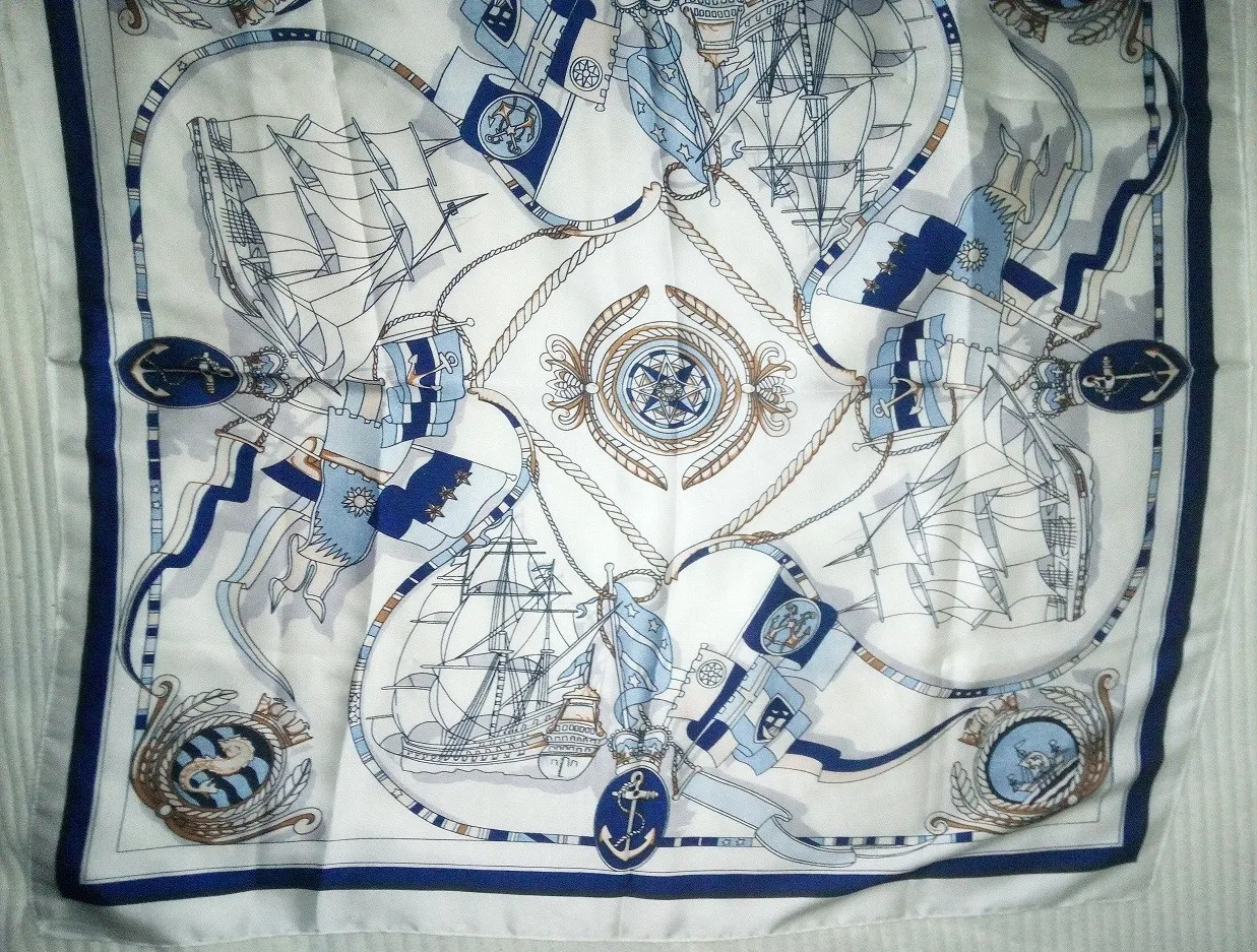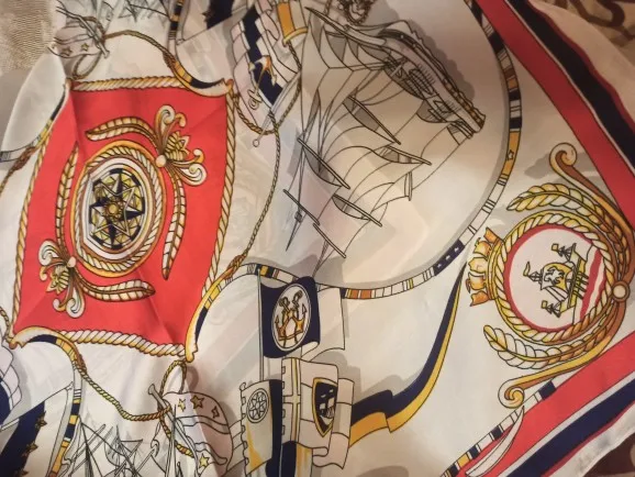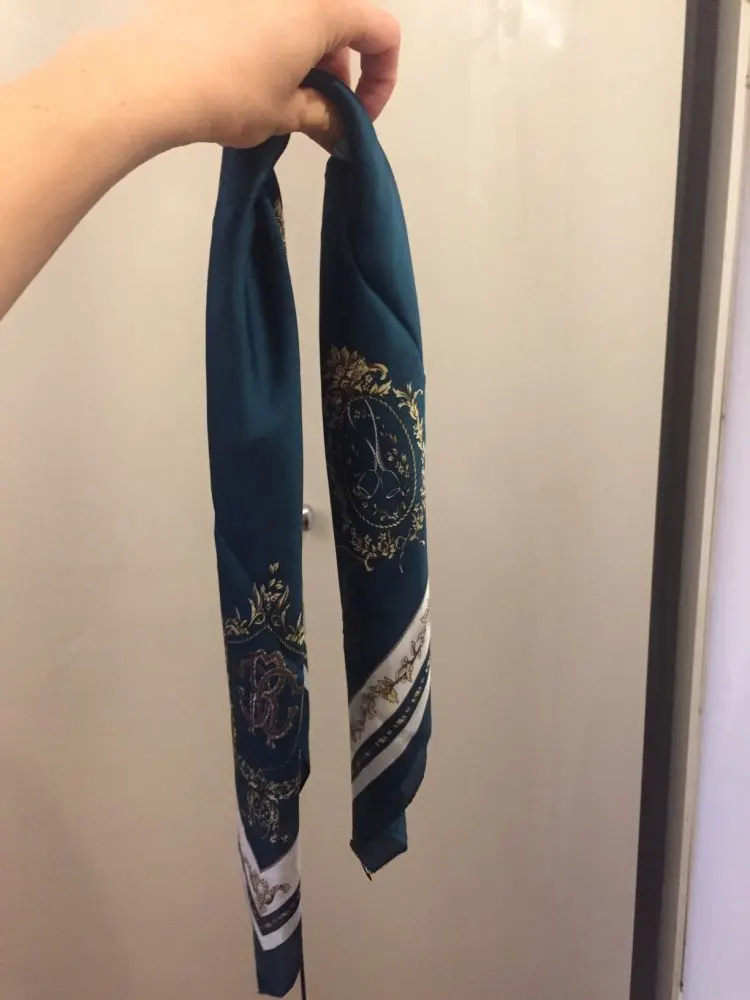 Мне нравится этот квадратный шарф! Морской дизайн и цвета красивые и соответствуют фотографиям. Ткань, конечно, синтетическая, но она жидкая, легкая, шелковистая и приятная. Размер удобный, не слишком маленький, не слишком большой. Я загрузил несколько фотографий нескольких простых узлов, которые вы можете сделать с этим размером, это очень универсально. Ткань не слишком блестящая, что я предпочитаю. Края обработаны достаточно аккуратно. Цвета темно-синего, небесно-голубого и белого подойдут ко всему. Я не могу дождаться, когда надену этот шарф, он сразу станет любимым. Красиво и 100% рекомендуется!