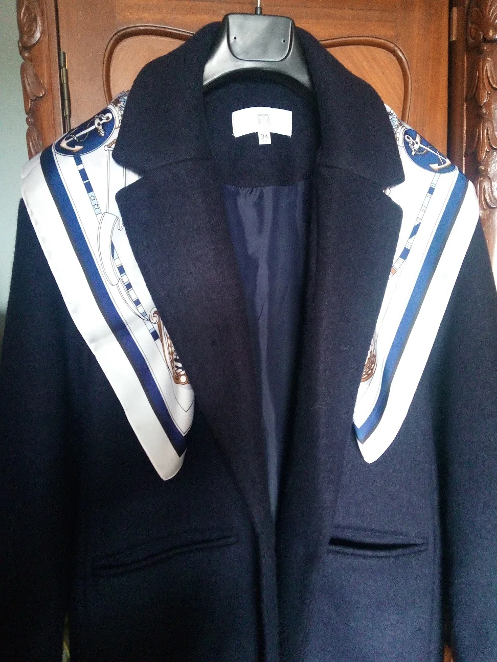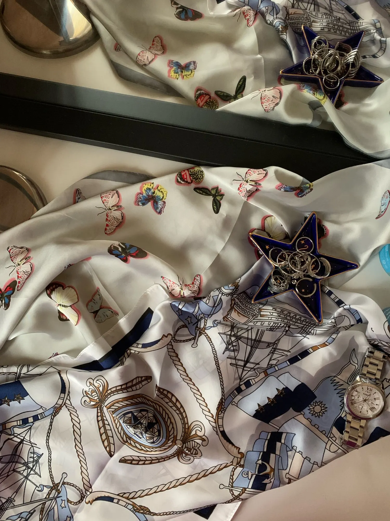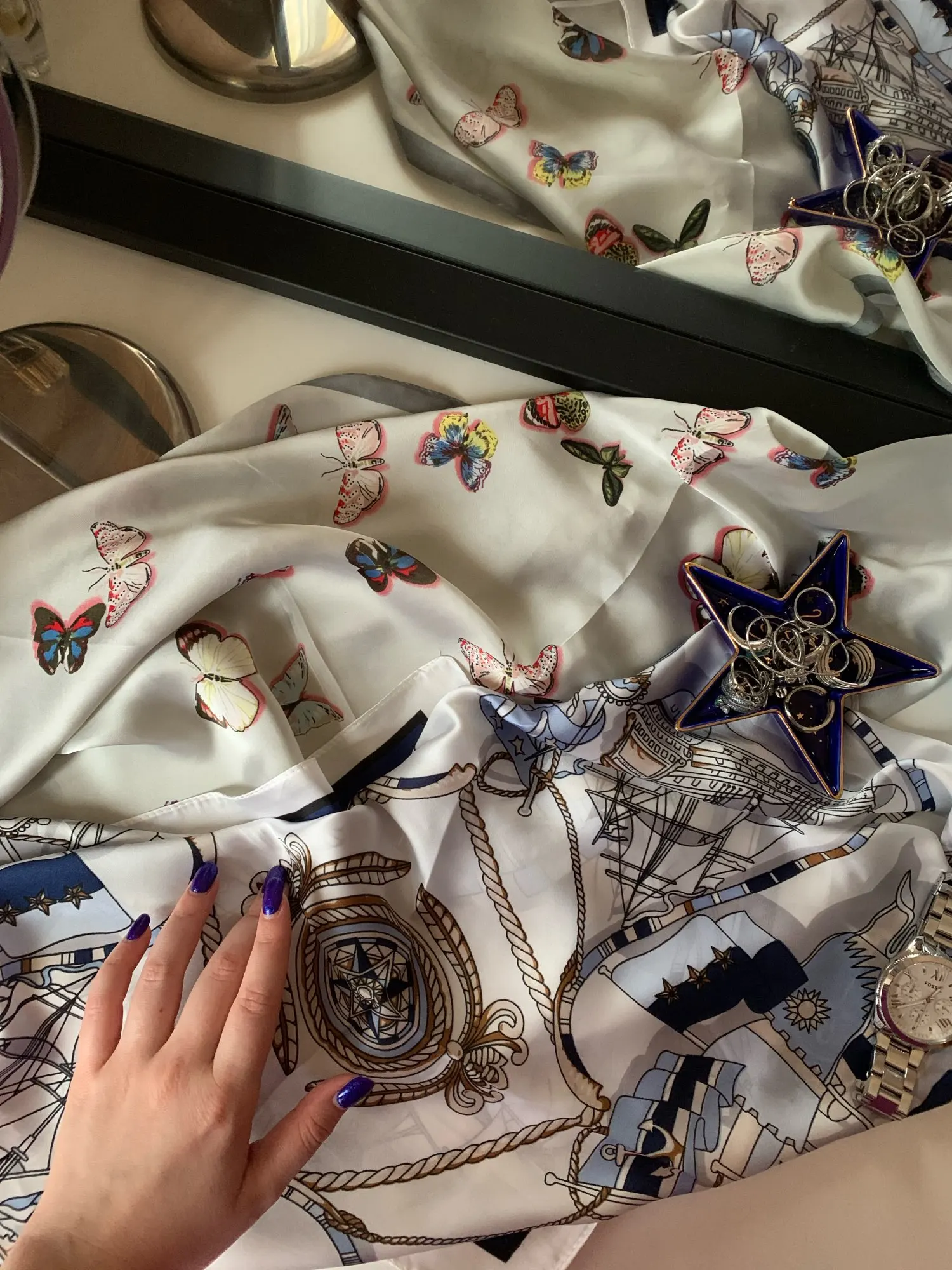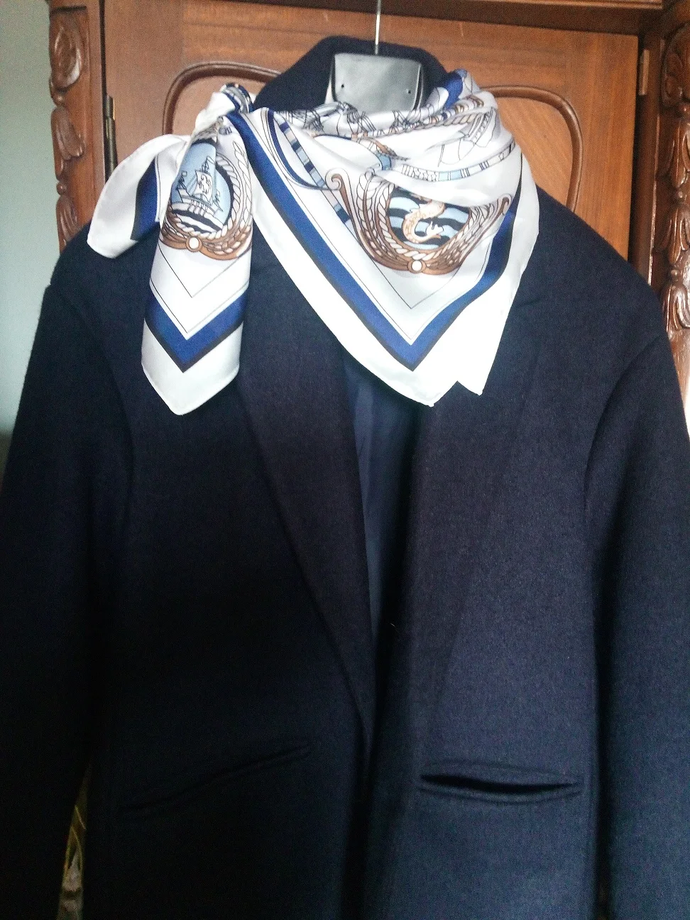 Мне нравится этот квадратный шарф! Морской дизайн и цвета красивые и соответствуют фотографиям. Ткань, конечно, синтетическая, но она жидкая, легкая, шелковистая и приятная. Размер удобный, не слишком маленький, не слишком большой. Я загрузил несколько фотографий нескольких простых узлов, которые вы можете сделать с этим размером, это очень универсально. Ткань не слишком блестящая, что я предпочитаю. Края обработаны достаточно аккуратно. Цвета темно-синего, небесно-голубого и белого подойдут ко всему. Я не могу дождаться, когда надену этот шарф, он сразу станет любимым. Красиво и 100% рекомендуется!