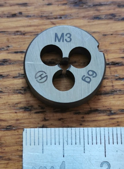 Эта плашка просто гигантских размеров (25 мм). Причем, на сайте описания ее не было. Такой плашке даже вороток не нужен, вполне удалось нарезать резьбу на стальном прутке d2, вращая ее пальцами рук. Однако она фактически режет резьбу M1.8x0.4, поэтому на такой резьбе гайка M2 слегка болтается. Тем, для кого это важно, эту плашку рекомендовать не могу.