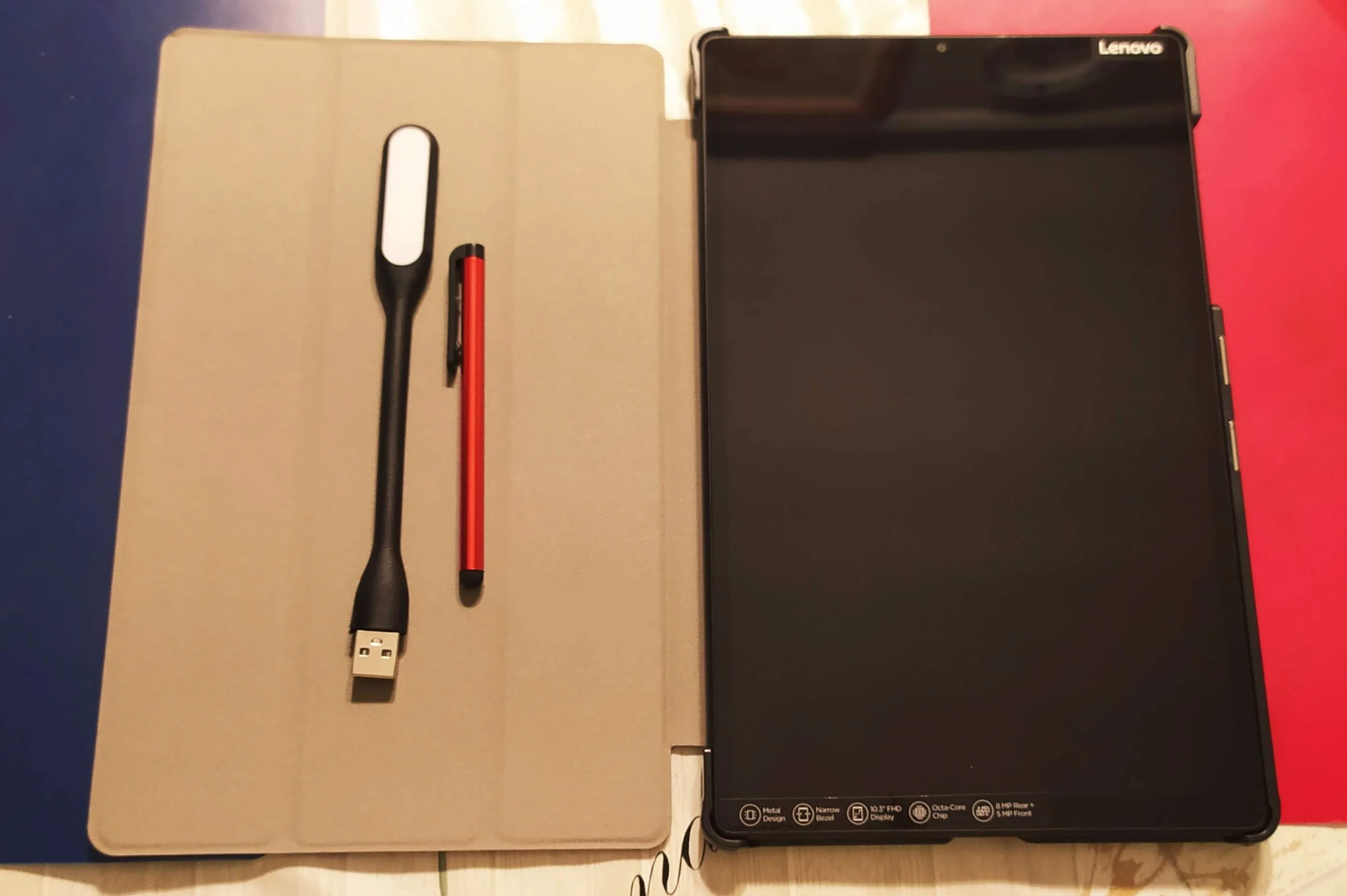 Доставка через "Пятерочку" не рулит. Три дня по Китаю и 37 дней по России. Что очень долго для посылки по треку. Чехол отличный, на планшете сидит как влитой. Спасибо продавцу за подарки. Стилус работает хорошо и светодиодная лампа тоже пригодится.