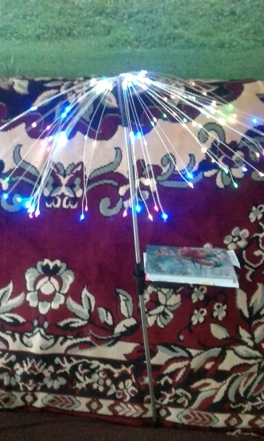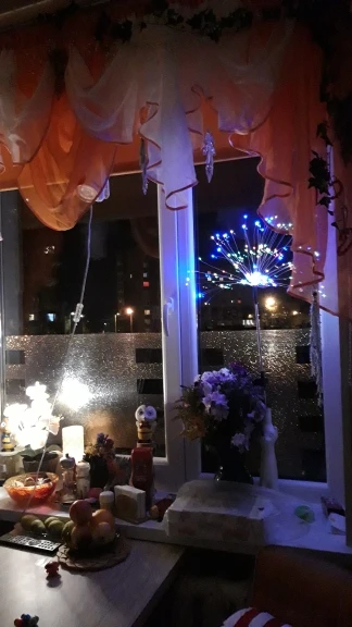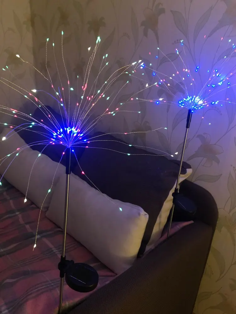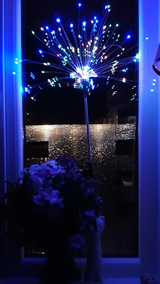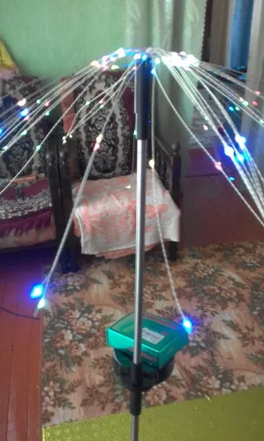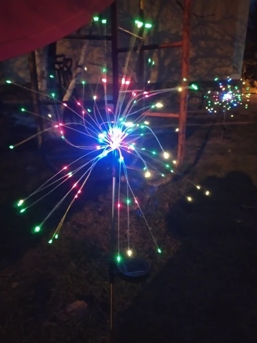 Очень эффектный и красивый светильник, оказался крупнее, чем я ожидала. Все, кто видит, в полном восторге. Пришел частично заряженным, проработал всю ночь и на утро оставался ещё заряд. Два режима работы: постоянный свет и мигание. Диоды располагаются на проволочках, можно придать любую форму. Пока на улице холодно и дождливо, используем дома. Ближе к лету однозначно закажу ещё для улицы. Доставка до Иваново месяц.
