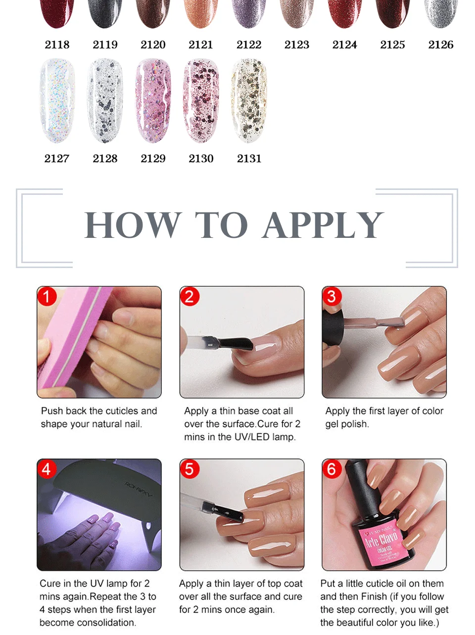 1.--Очистите ногти, затем обрежьте поверхность ногтей, как обычный процесс маникюра.2.--Полностью встряхните лак, он может сделать цвет лака сбалансированным. (ВАЖНО)3.--Сначала нанесите базовый гель, который может сделать лак длительным дольше, вылечите УФ-лампой или светодиодный лампой. (Необходимо)4.--Нанесите лак непосредственно, вылечивайте УФ-лампой в течение 2-3 минут или вылечивайте светодиодный лампой в течение 60 секунд; при высыхании нанесите второй слой и вылечивайте УФ-лампой или светодиодный лампой снова.5.--Пальто со съемным верхним слоем, которое может сделать цвет более блестящим, излечивается УФ-лампой или светодиодный лампой.