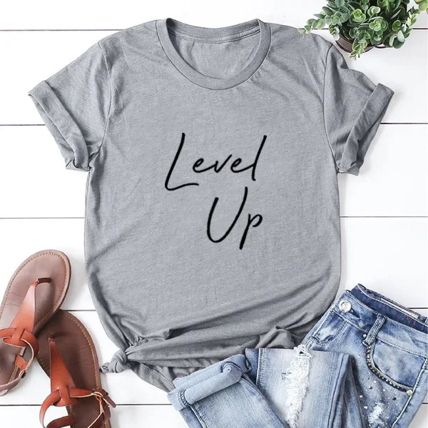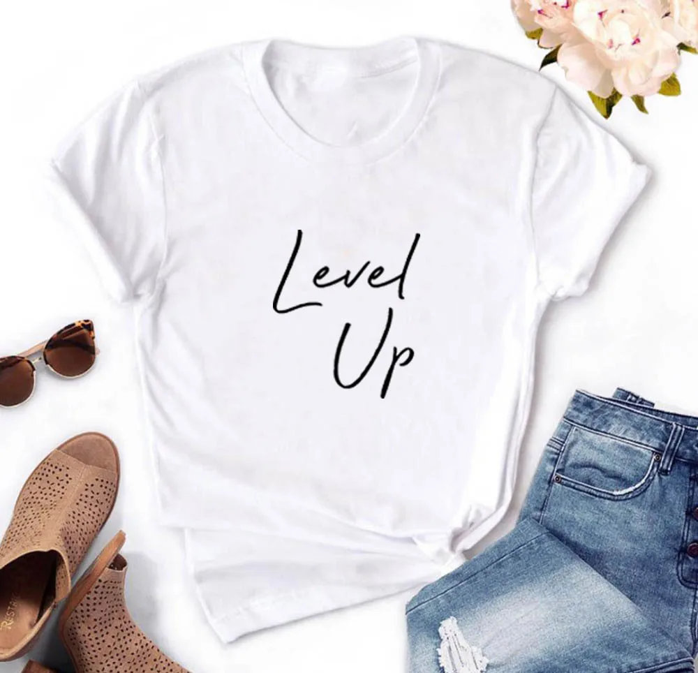 Женская футболка с принтом LEVEL UP, хлопковая футболка с коротким рукавом и круглым вырезом, черная, Белая Летняя свободная футболка