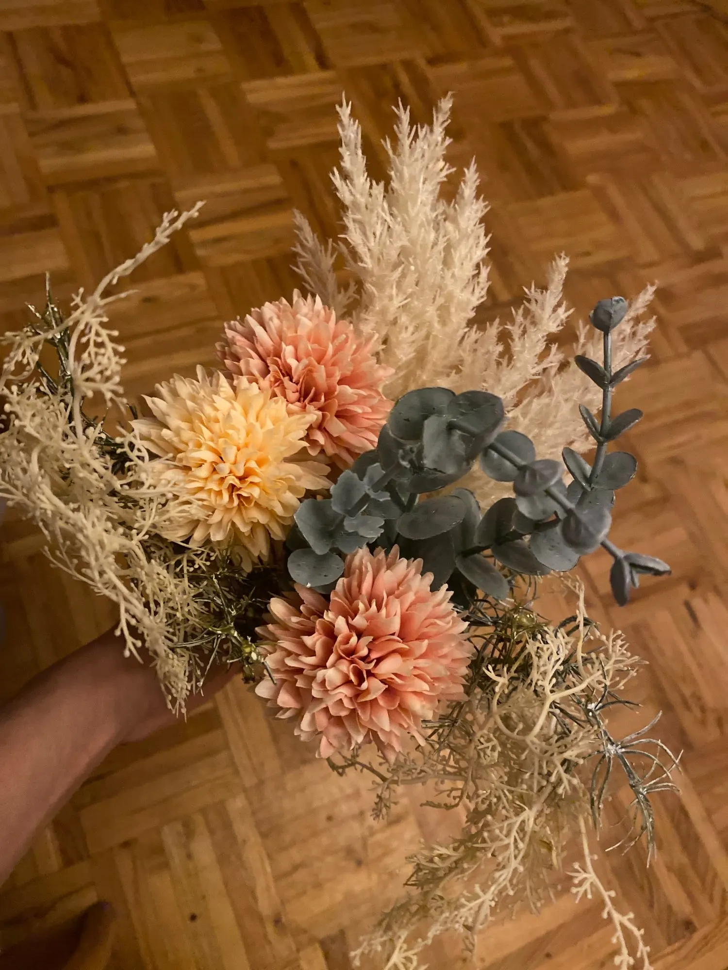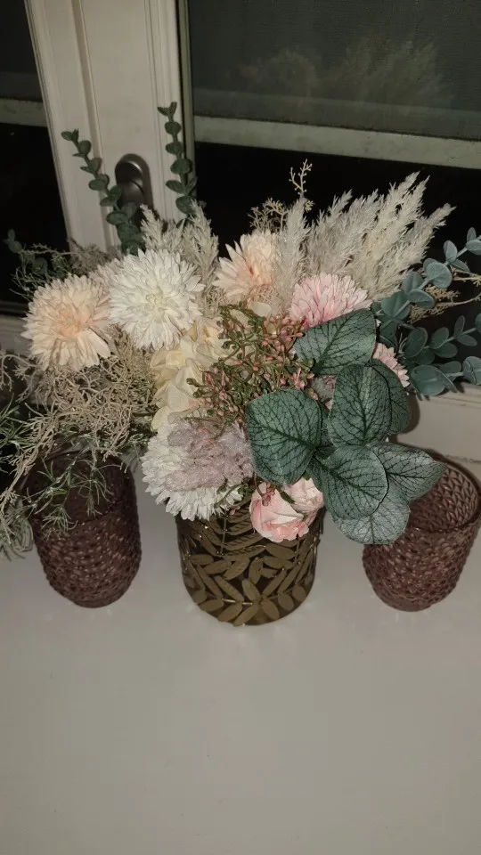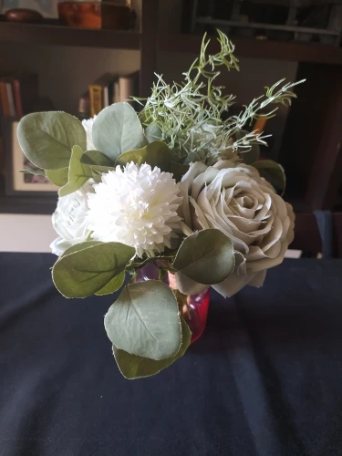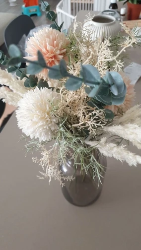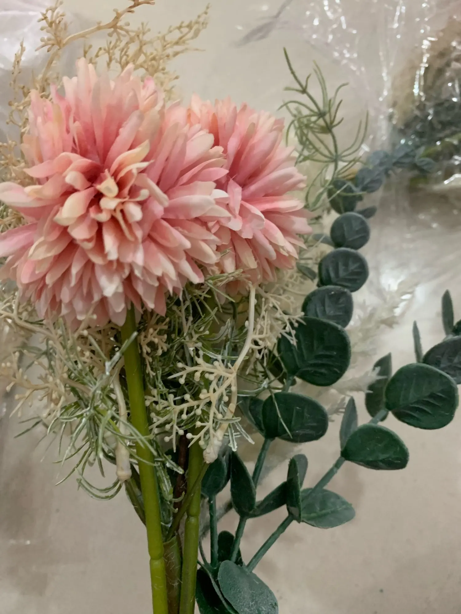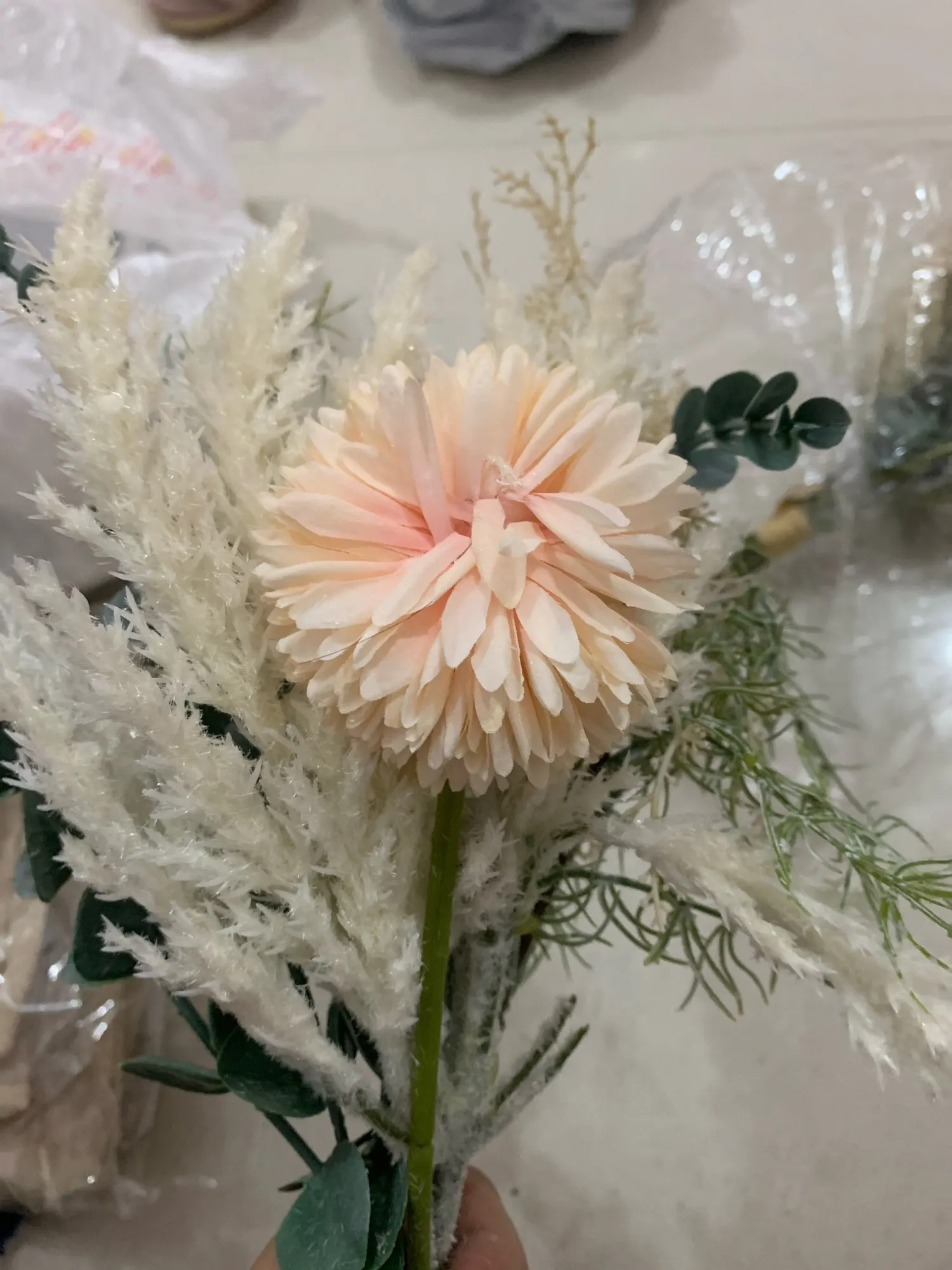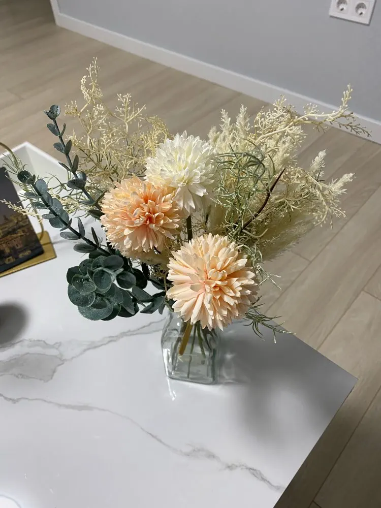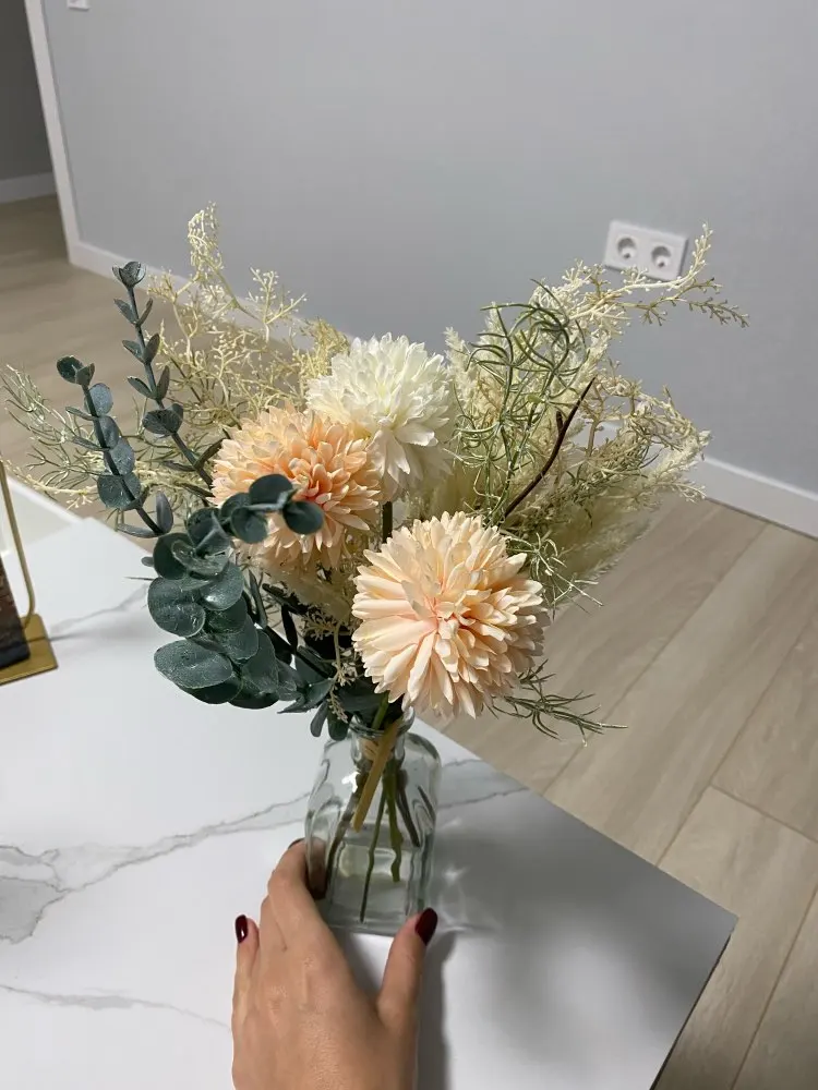 Хороший букетик, но сыпется. Поэтому лучше поставить его и не трогать. Можно сбрызнуть лаком для волос для крепкости.