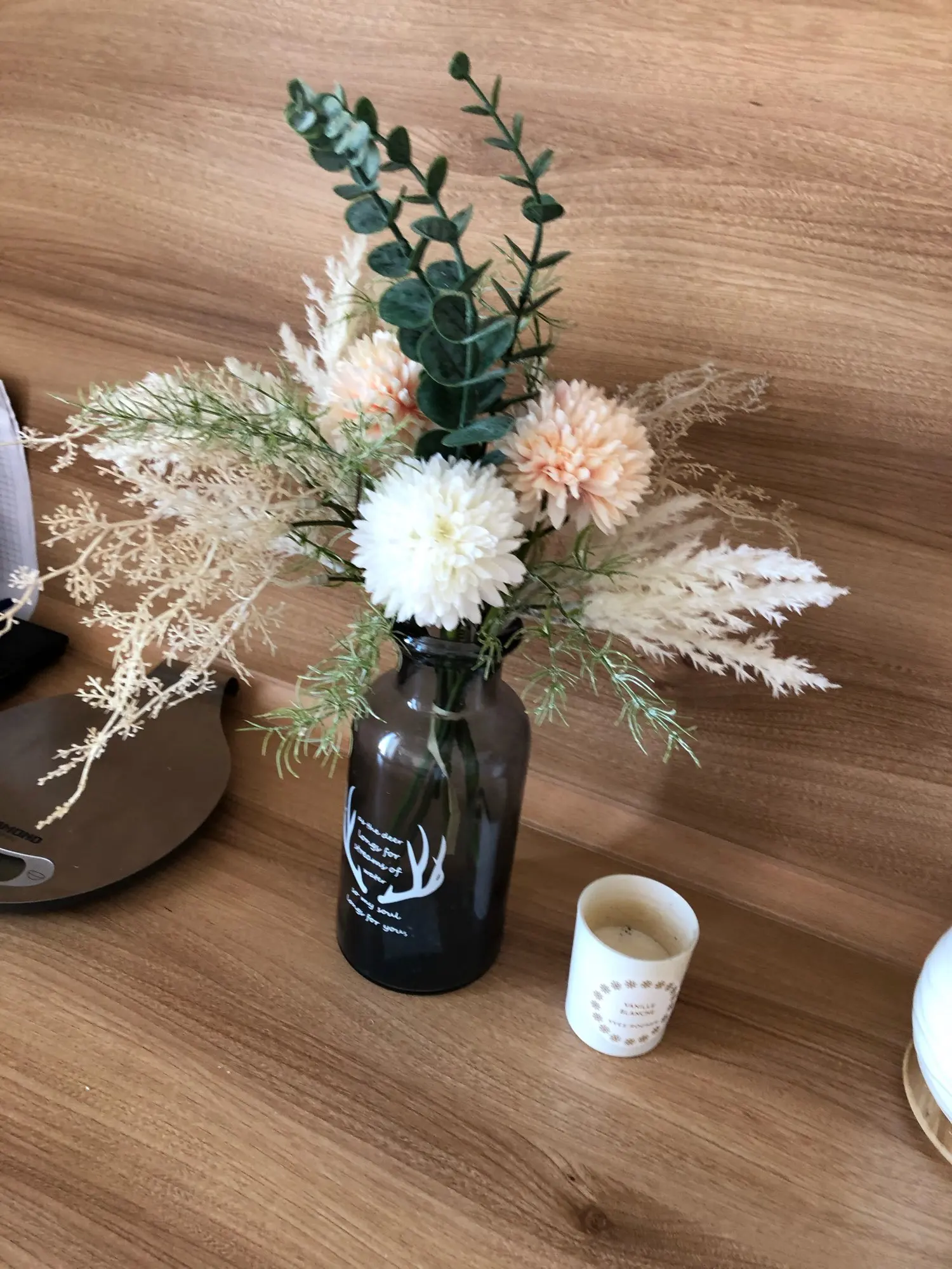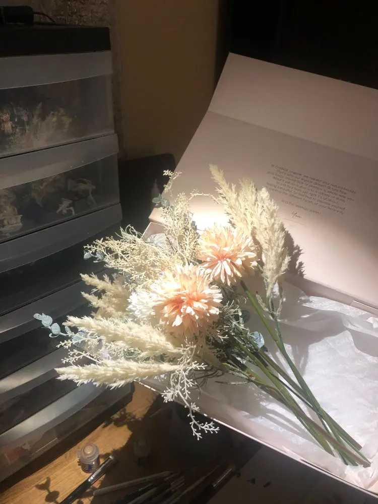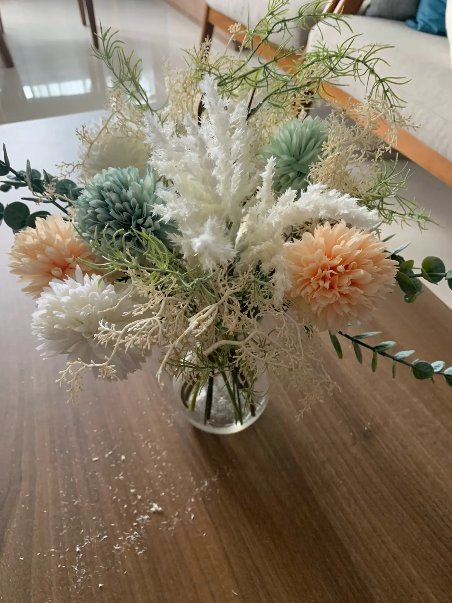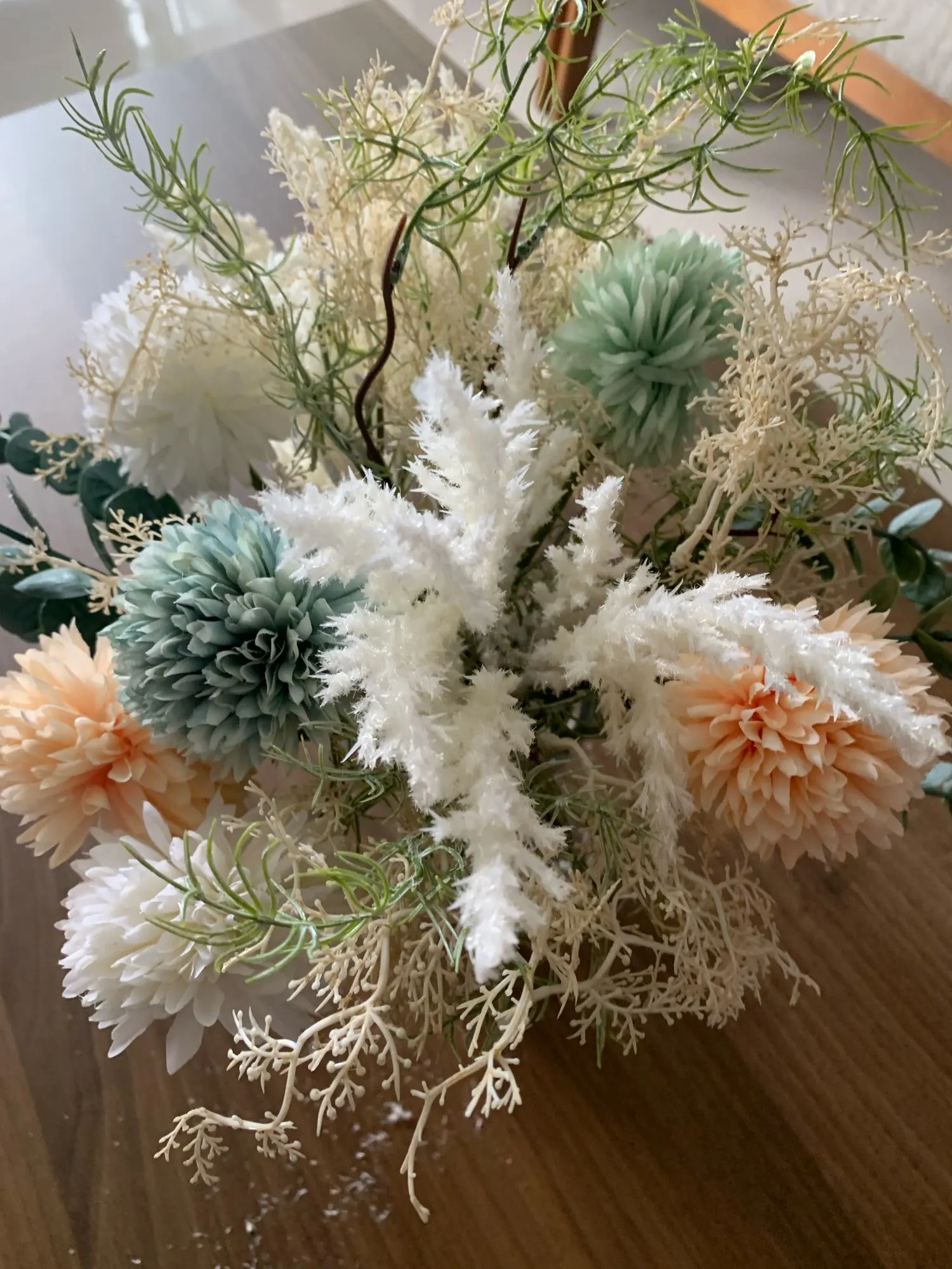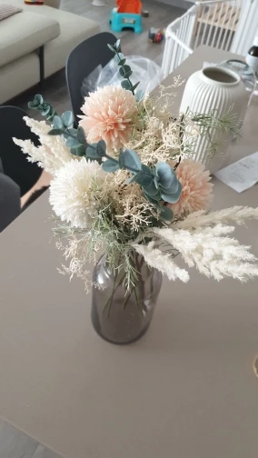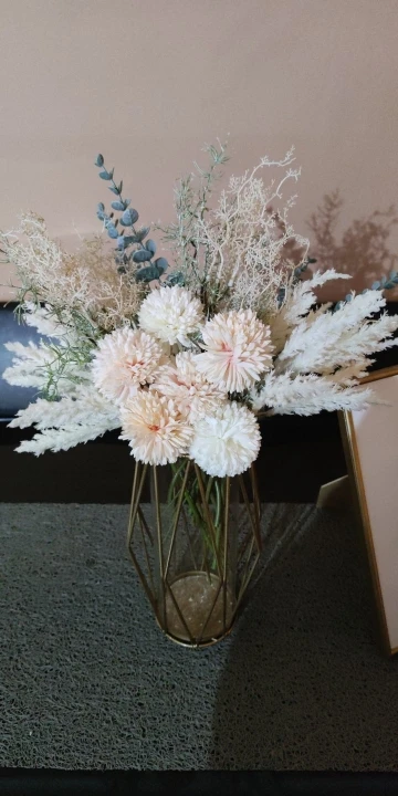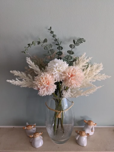 Хороший букетик, но сыпется. Поэтому лучше поставить его и не трогать. Можно сбрызнуть лаком для волос для крепкости.
