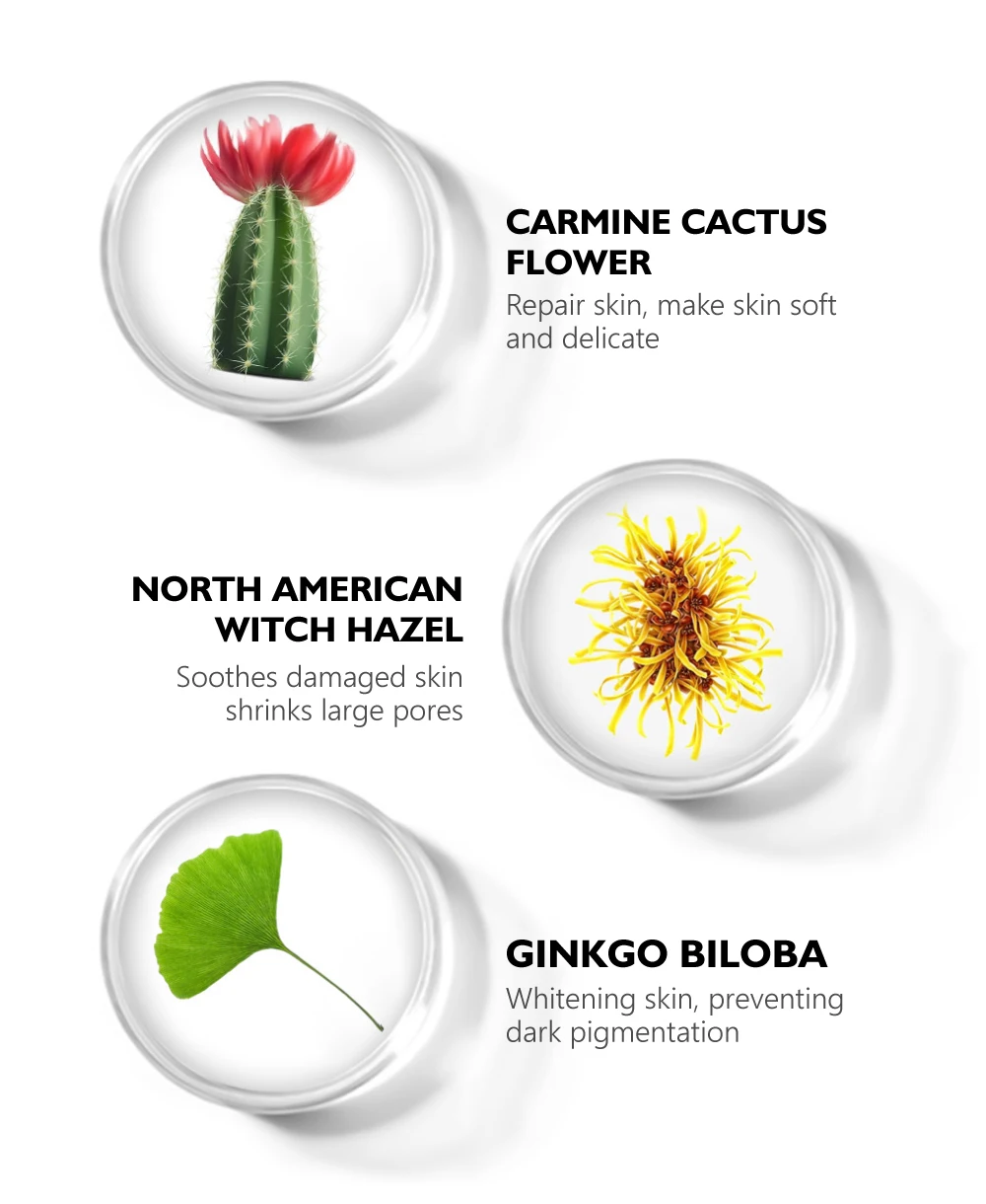 Бамбуковый уголь: может поглощать черные точки, лишнее масло и грязь для кожи, тщательно удалять черные точкиЦветок кактуса карминВосстанавливает кожу, делает кожу мягкой и нежнойСеверная АмерикаВедьма орешник успокаивает поврежденную кожуСжимает большие порыГинкго билоба отбеливание кожи, предотвращение темной пигментации