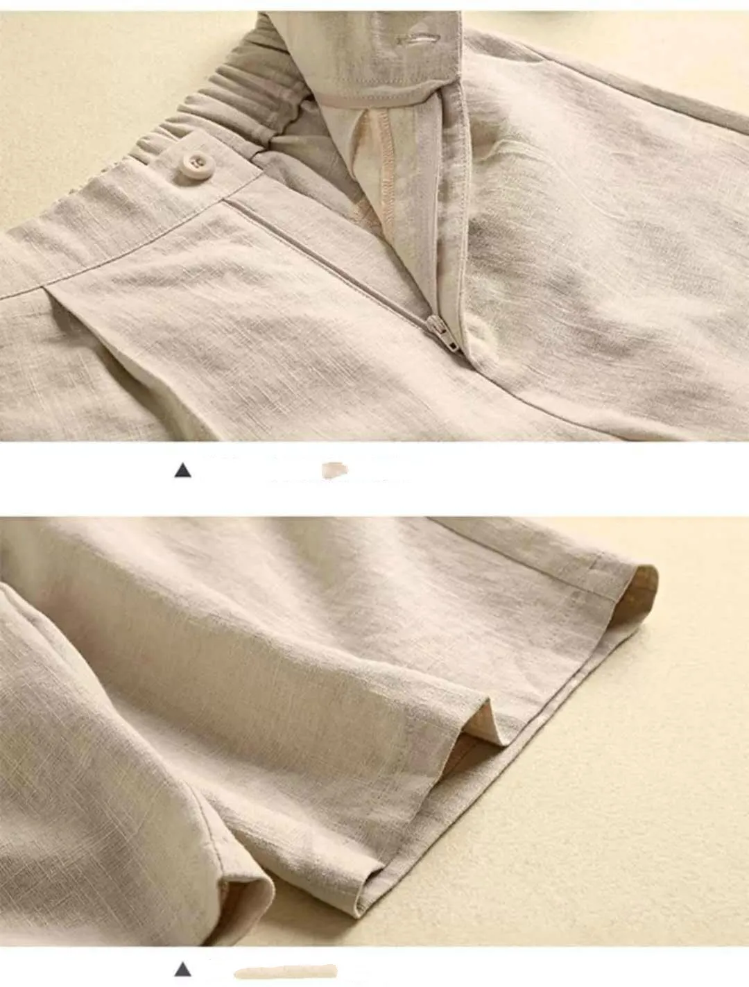 Тканина трохи тягнеться. Не 100% льон, проте дуже приємна до тіла. Висока посадка, хороший пошив. Маломірять дещо. Вірніше, щоб сідали вільно, як на картинці, треба замовляти на розмір більші, ніж зазвичай носите.