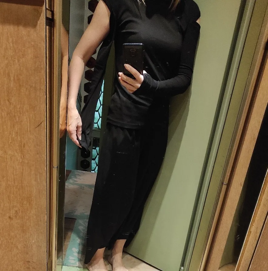 Удобная черная футболка. Очень понравился дизайн : он позволяет убрать рукава, когда жарко, повязав их за спиной или на груди. Качество фабричное, в составе доминирует хлопок, но с этикеткой на все 100 я не соглашусь : ткань хорошо тянется и есть характерный, для синтетики блеск. На рост 167 см, 57 кг, ог 87, плечи 41 см, я взяла L. Футболка подошла отлично. Обратите внимание на узкие рукава, мне они подошли. Заказом довольно - доставка быстрая, все супер.
