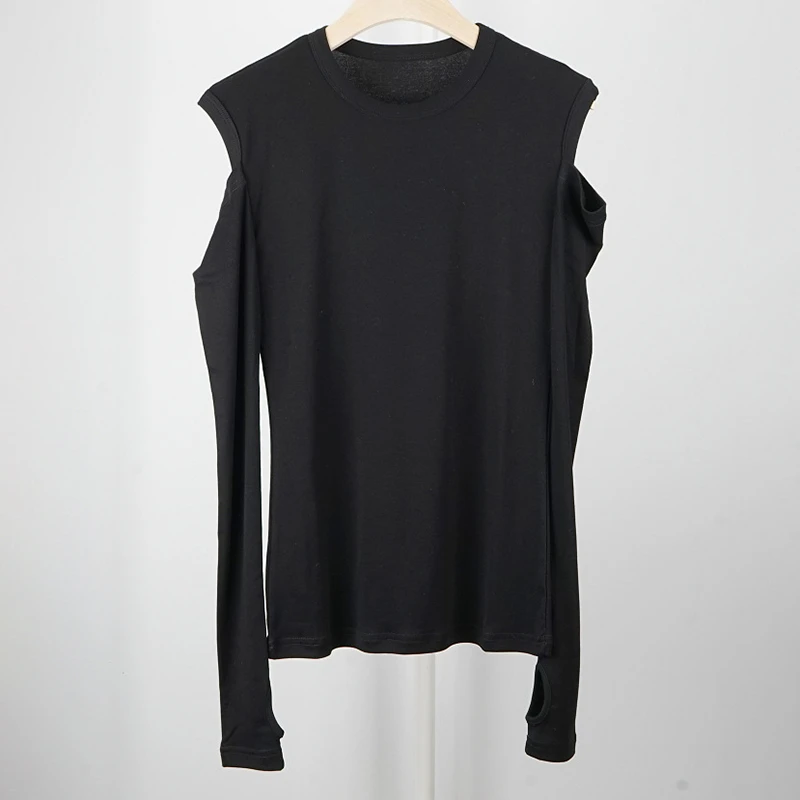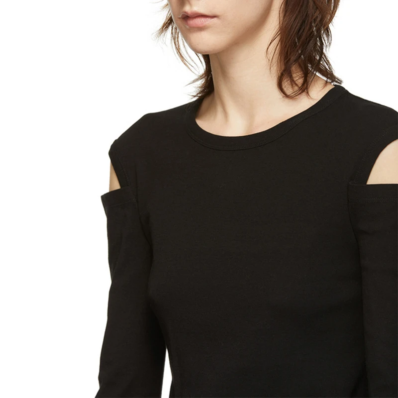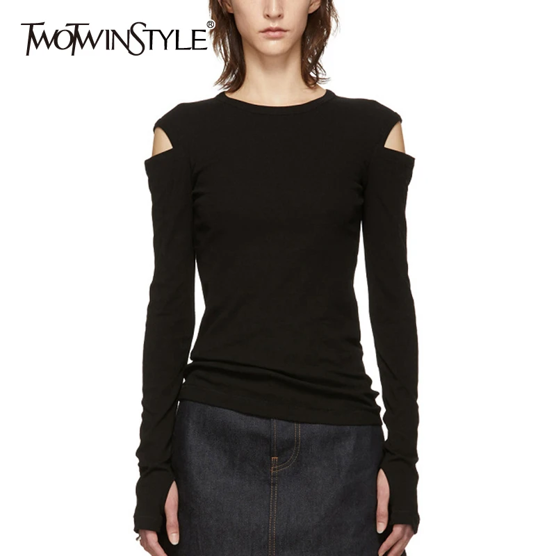 Женская футболка TWOTWINSTYLE, черная Повседневная футболка с круглым вырезом, длинными рукавами и открытыми плечами, 2020