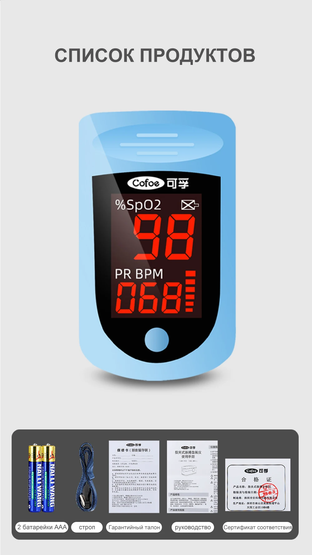 1 * Пульсоксиметр с кончиком пальца (батарея не входит в комплект) 1 * ремешок 1 * посылка 1 * Сертификат утверждения