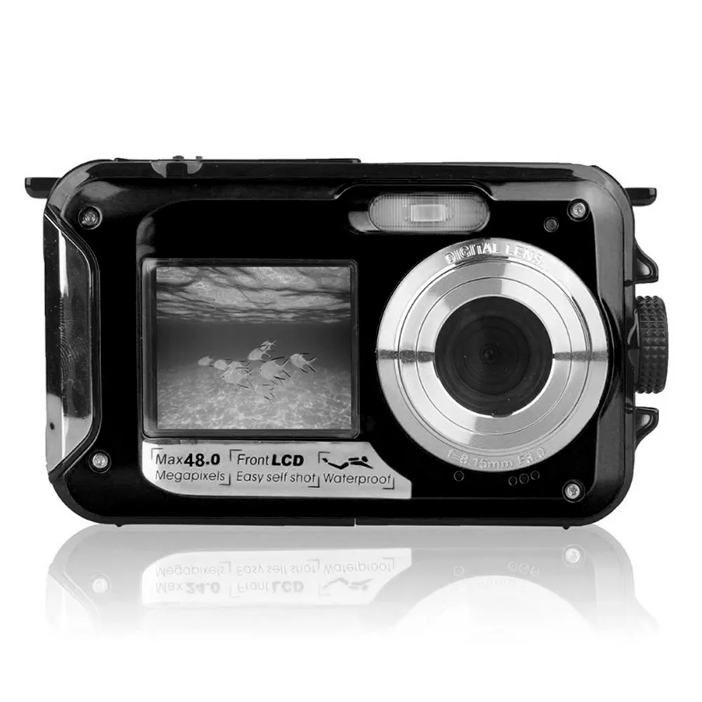 Особенности:1.Водонепроницаемая HD камера: с 48 миллионов пикселей, наша подводная камера может делать высококачественные изображения с богатыми деталями.2. Портативный и идеально подходит для всех видов деятельности, таких как: Сноркелинг, кемпинг, плавание, дайвинг, beaching и т. д.3.Двойной экран: Эта двойная подводная камера оснащена 2,7 дюймовым задним экраном и 1,8 дюймовым передним экраном.4. Распознавание лица, стабилизация изображения, функция веб-камеры, различные режимы сцены.5. Встроенный динамик, микрофон. Встроенный светодиодный фонарик. Высокоскоростная непрерывная съемка. Технические характеристики:Водонепроницаемость: 3 м (макс.)Пиксели: 2,7 K:2688x1520; FHD:1920x1080;HD 1280x720P;48 МП (макс.)Двойной экран: 1,8-дюймовый Передний сенсорный экран, 2,7-дюймовый TFT заднего экранаКарта Micro SDs поддерживает до 128 Гб (не входит в комплект)16x цифровой зум