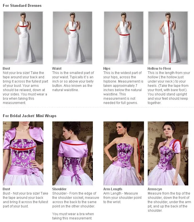 Таблица размеров и метод измерения, если вы хотите сделать заказ, пожалуйста, выберите любой стандартный размер при заказе, затем напишите свои измерения в коробке сообщений при оплате в соответствии со следующим методом измерения свадебного платья.
