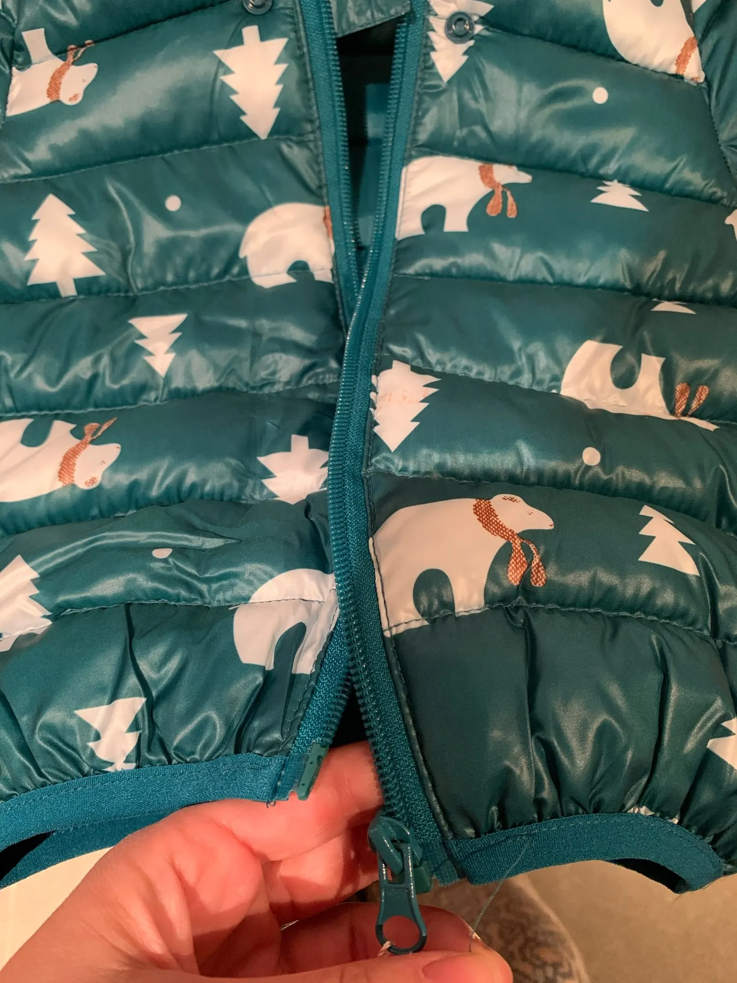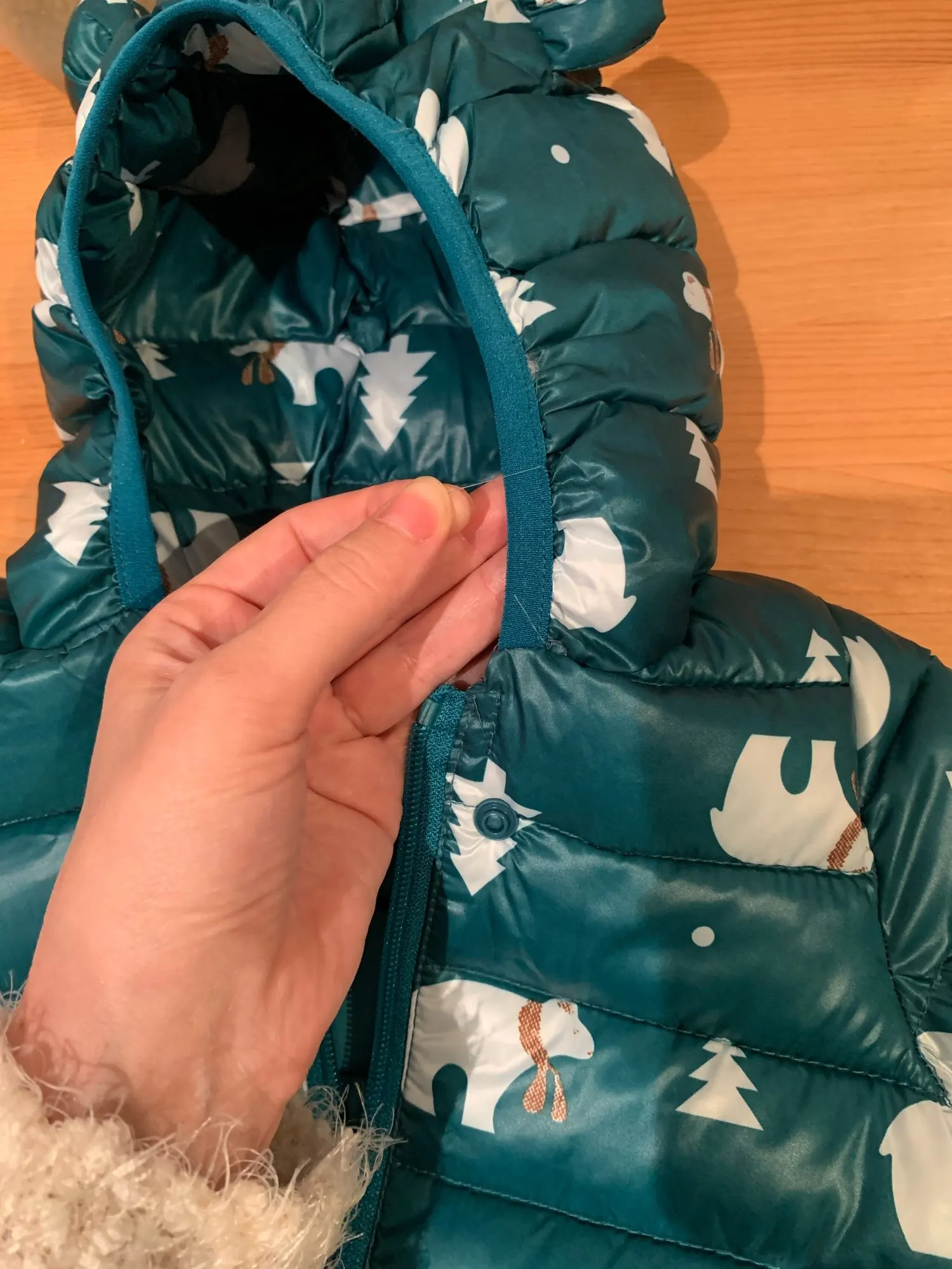 Заказ пришёл за 4 недели. Курточка симпатичная, как на фото. Качество хорошее, ничем не пахнет, торчит пару ниточек, но это не страшно, можно и обрезать. Взяли на вырост, так что пока не могу сказать ничего про размер. Набивка хорошая.