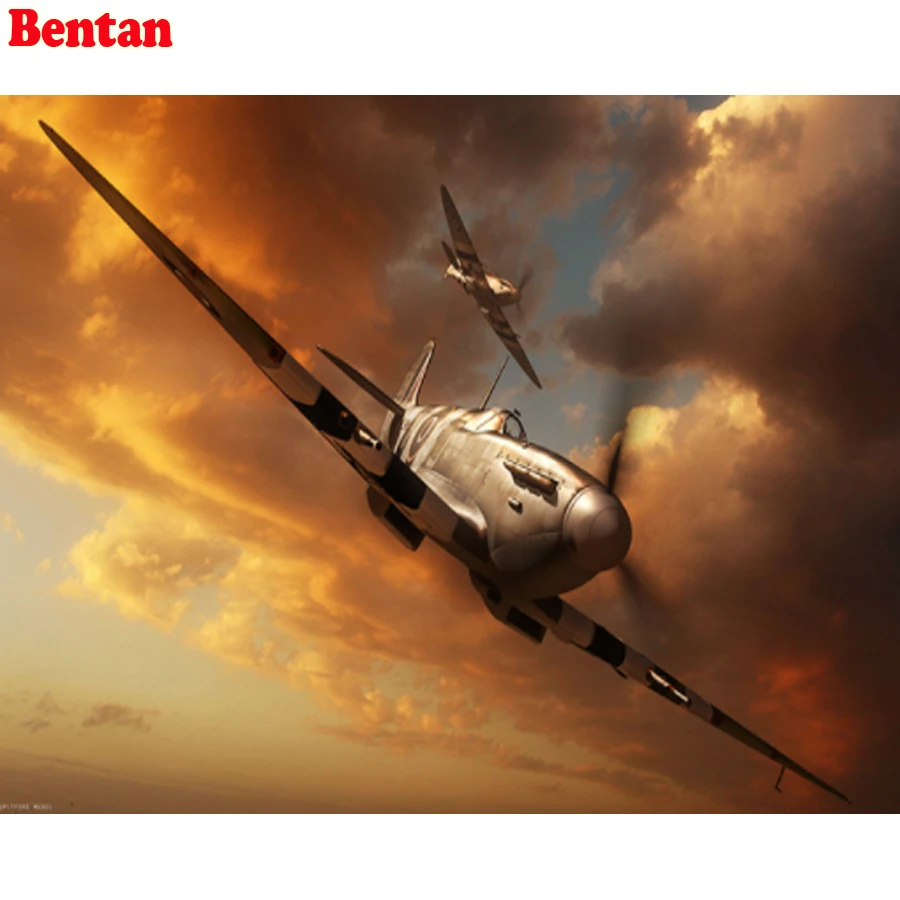 Алмазная картина алмазной мозаики в сумерках самолета Spitfire, стразы, круглые квадратные дрели, алмазная вышивка