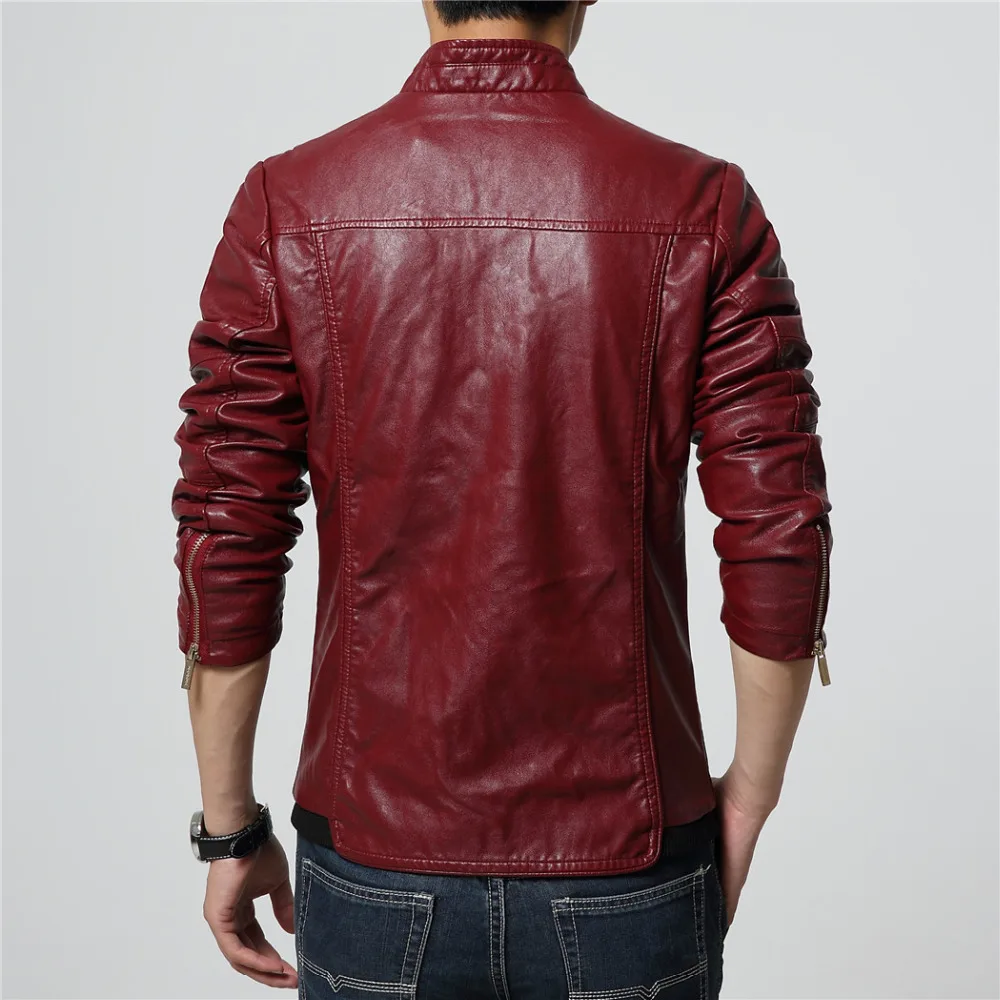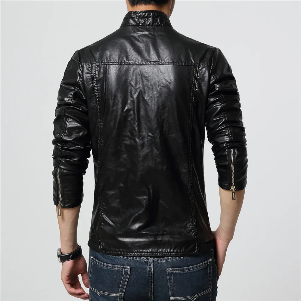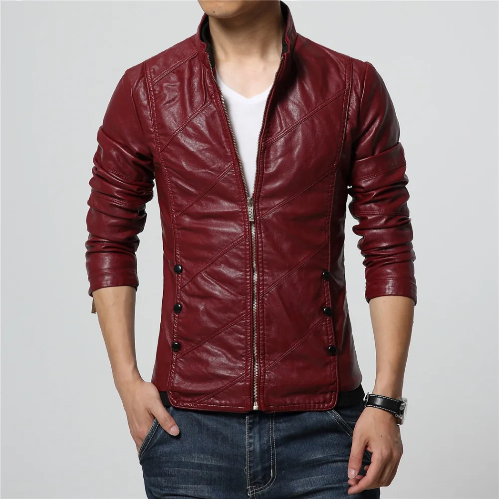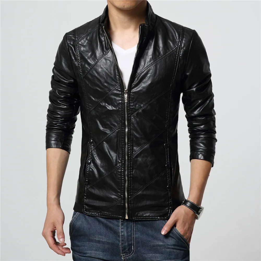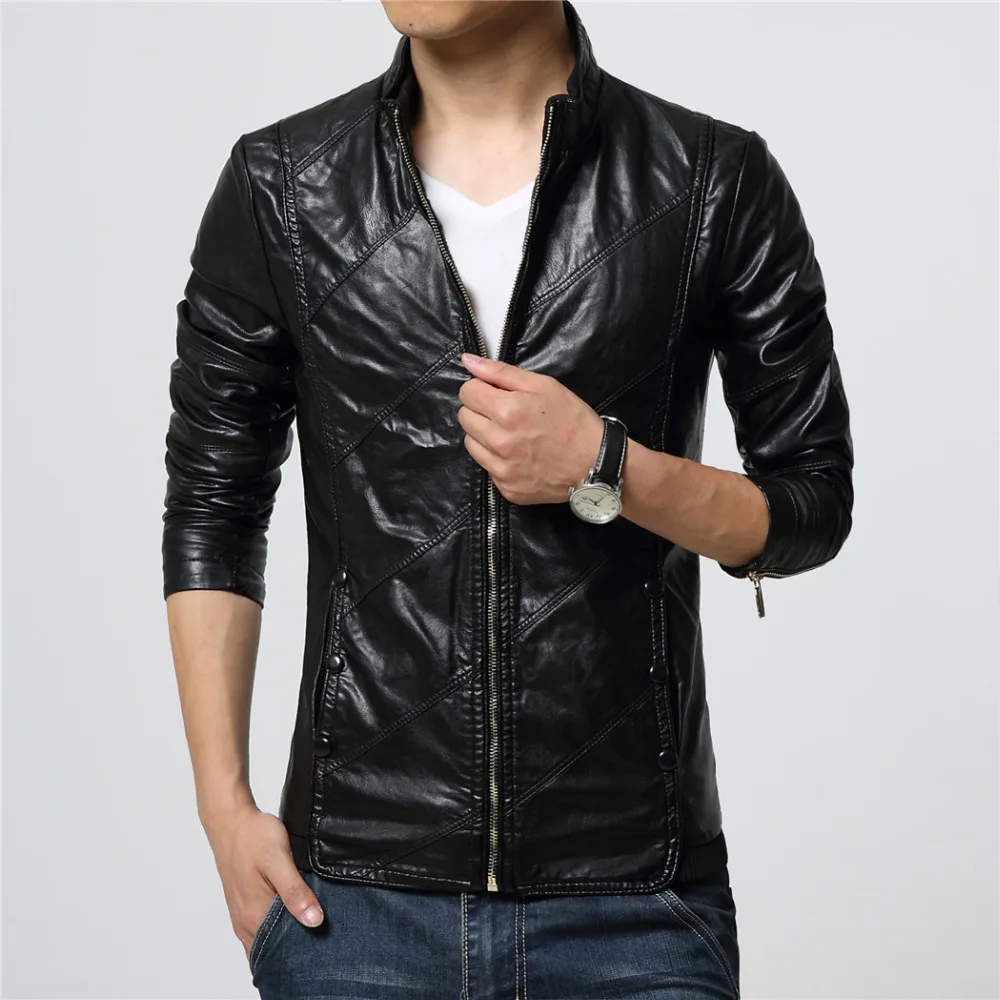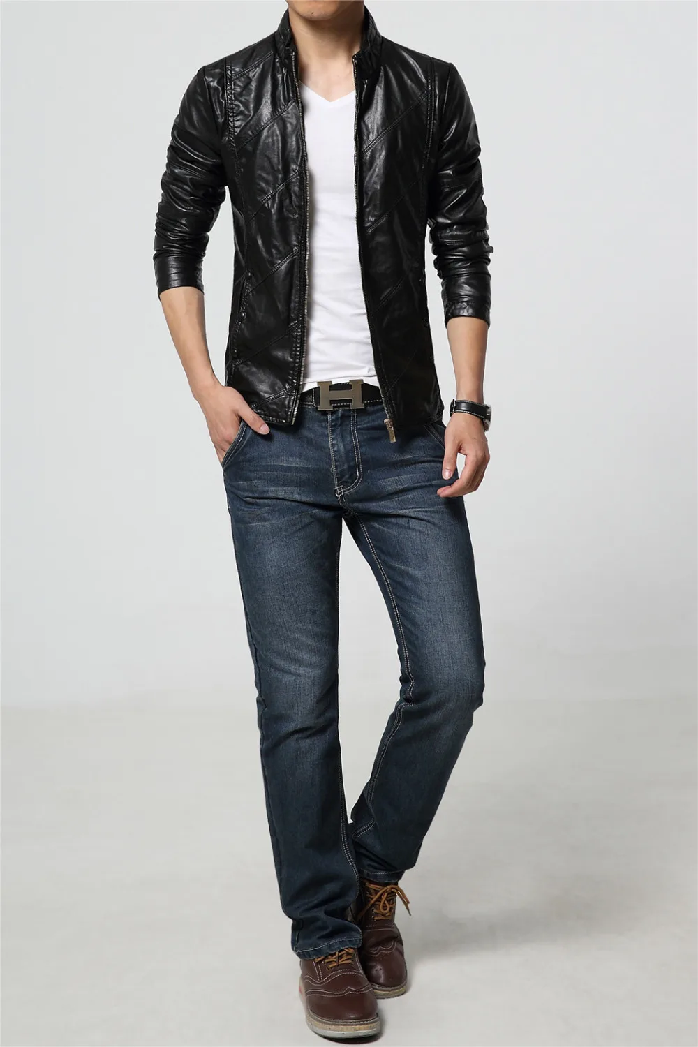 Мужская кожаная куртка, с воротником, тонкая байкерская куртка, однотонная куртка, размер 5XL-M, 2021