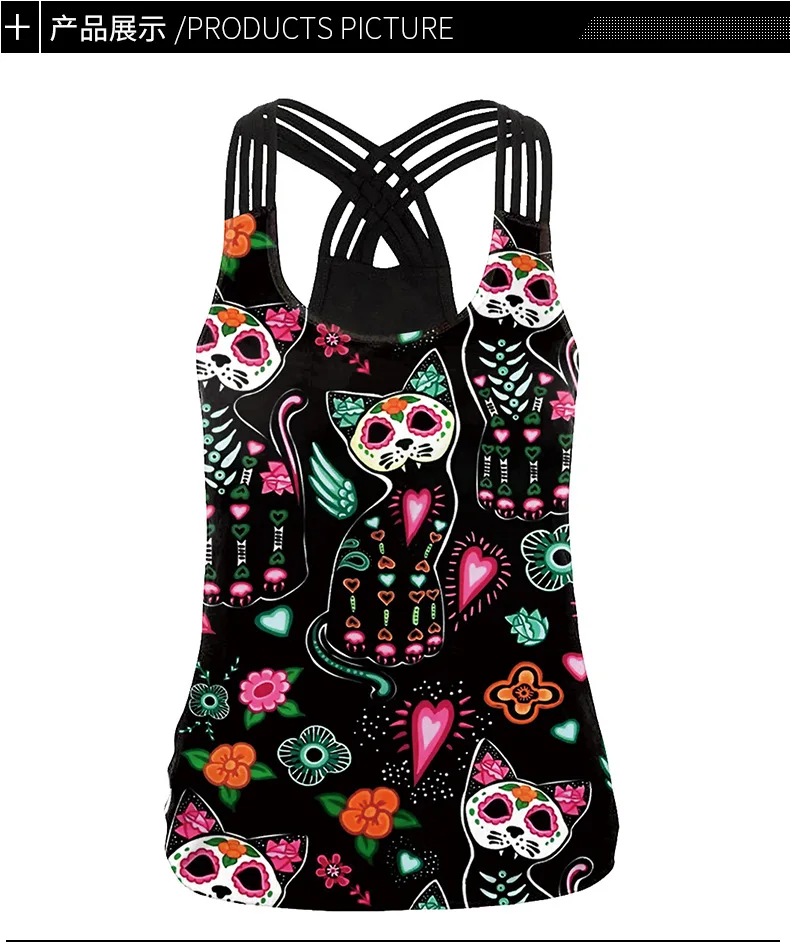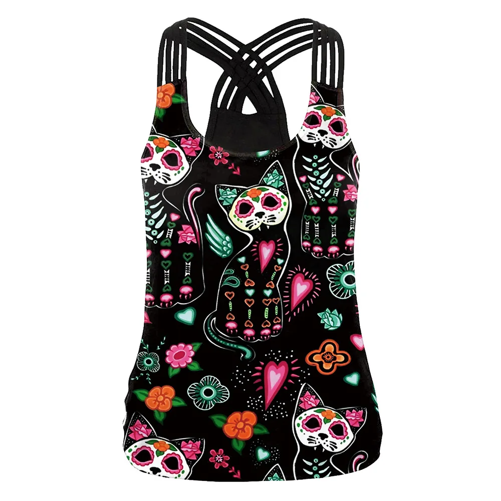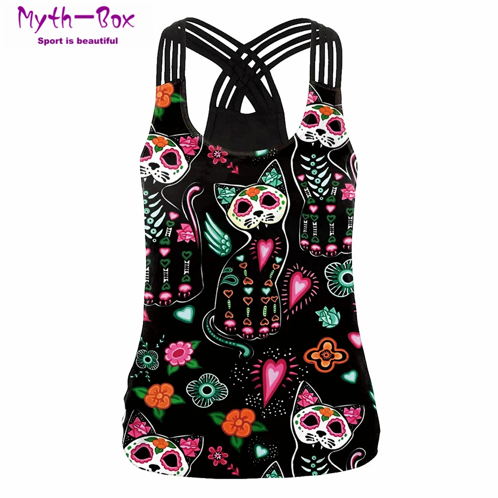 Летняя женская спортивная майка с 3D принтом кота и цветов, топы для йоги, жилет для бега, фитнеса, рубашки для йоги, Майки с перекрестными лямками для спортзала, футболки для активного отдыха