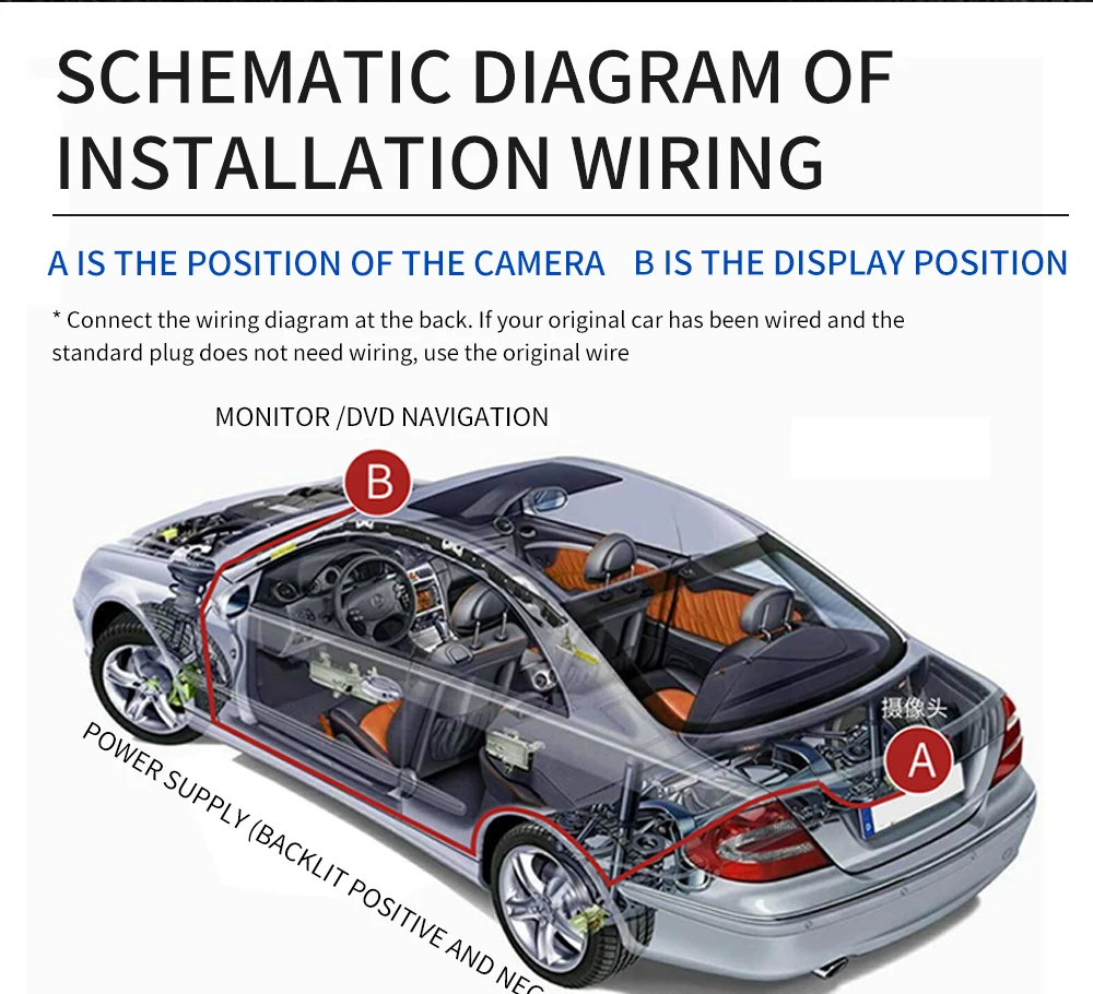 8) видео кабель подключения монитора, кабель питания подключения автомобиля задний светильник питания, Реверсивный, система мониторинга заднего хода автоматически начинает работать, вы можете ясно видеть автомобиль после ситуации