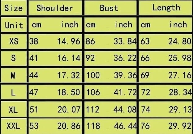 Размер плеч/см обхват груди/см длина/см Подходящая высота XS 38 44 60 160 см S 39 45 62 165 см M 40 50 64 170 см L 42 53 64,5 175 см XL 47 56 65 180 см XXL 48 59 68 185 см