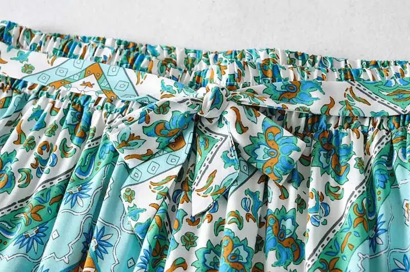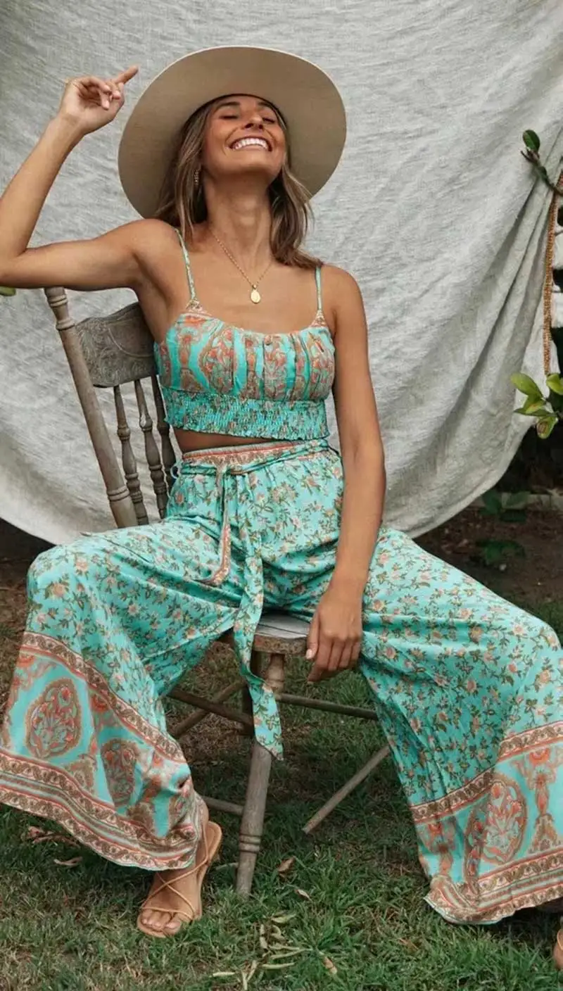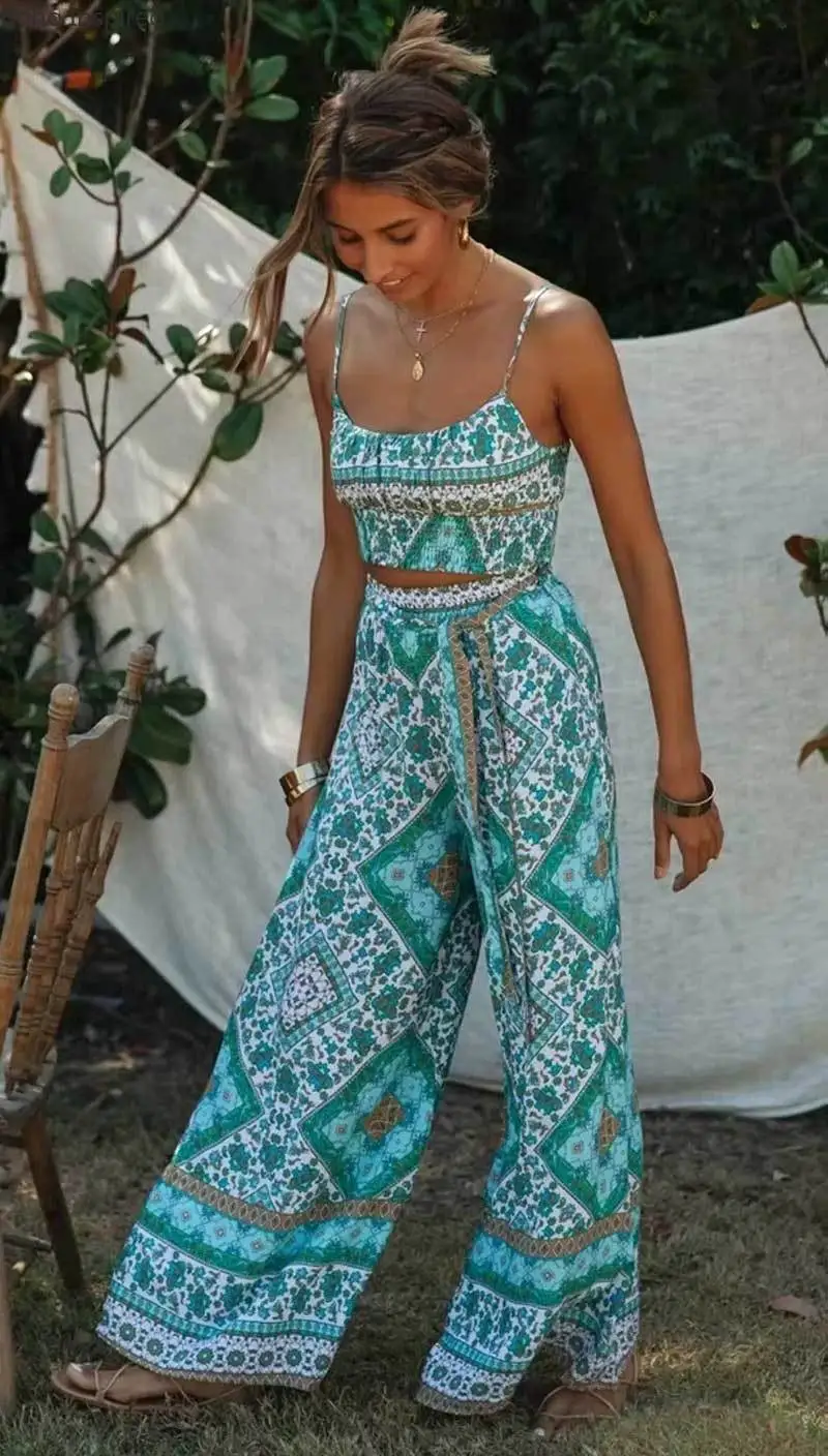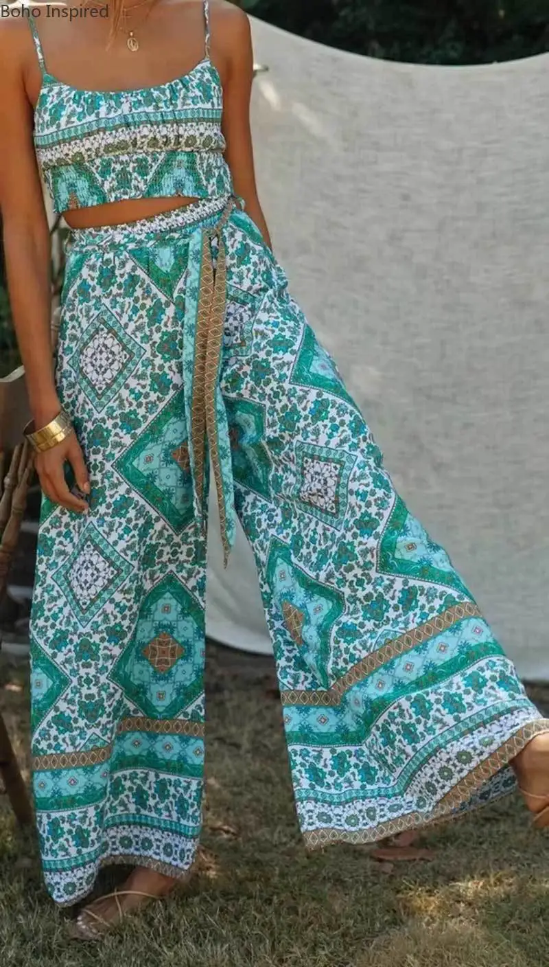 Комплект богемный Вдохновленный женский с цветочным принтом, винтажный короткий топ без рукавов, Эластичные Макси-брюки, повседневные пляжные штаны в стиле бохо, лето 2021