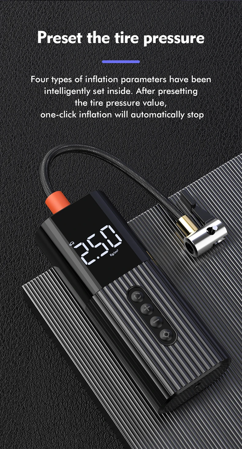[Быстрое автоматическое накачивание] насос для шин имеет 4 переключаемых блока давления (PSI, BAR, KPA, KG / CM²), поэтому вы можете установить давление в шинах по мере необходимости. При достижении заданного давления в шинах насос автоматически отключается. Максимальное давление накачки накачивателя составляет 150 фунтов на кв. дюйм.