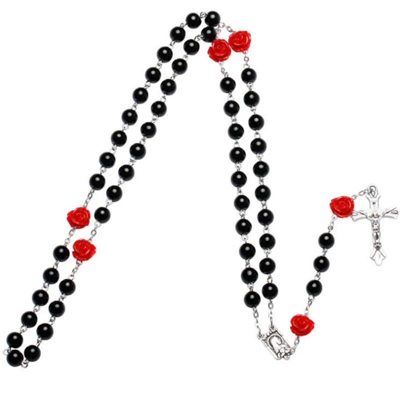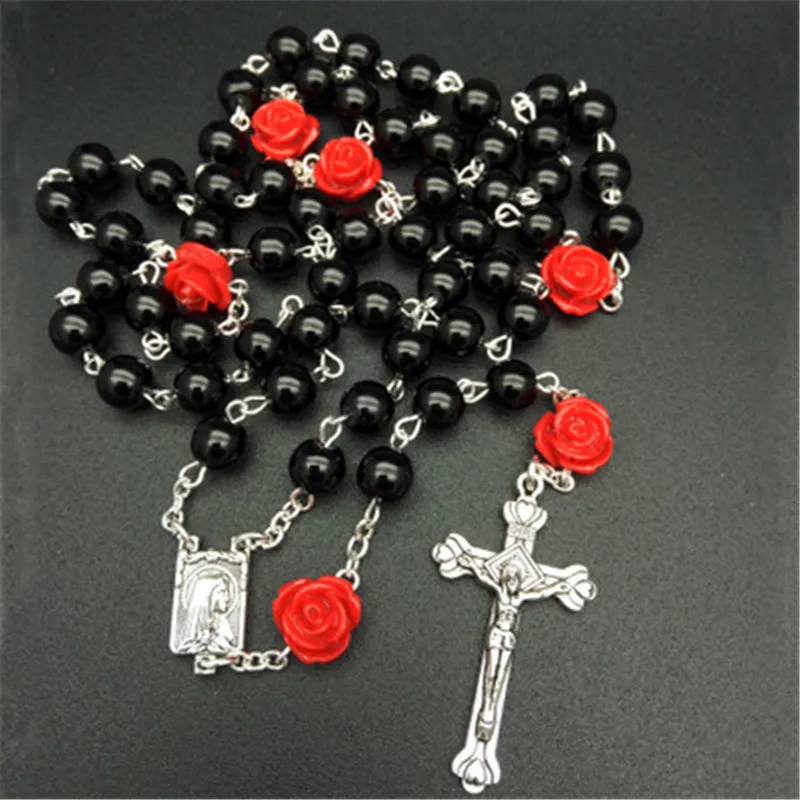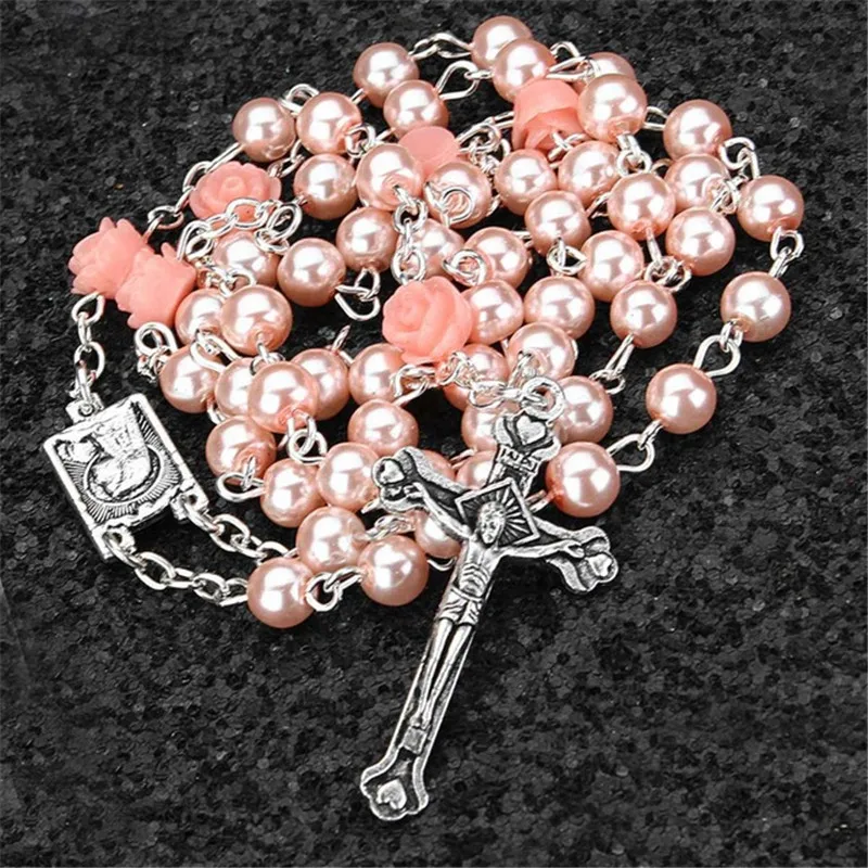 Ожерелье с имитацией жемчуга, 6 мм, крест, Розария, цветок, Дева Мария, подвеска, крест, ожерелье, ожерелье, религиозная бижутерия