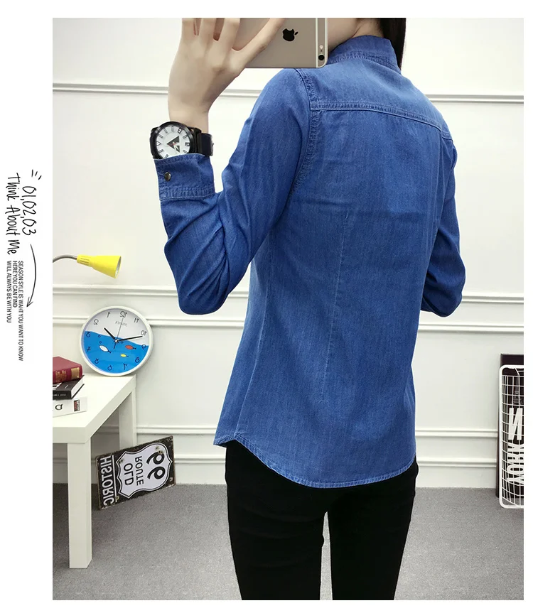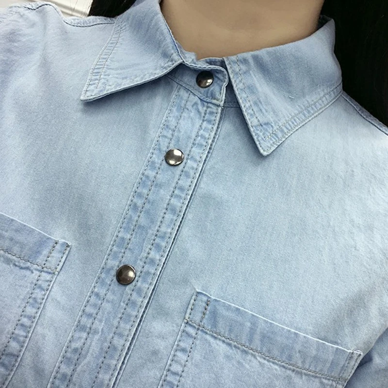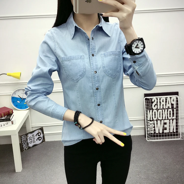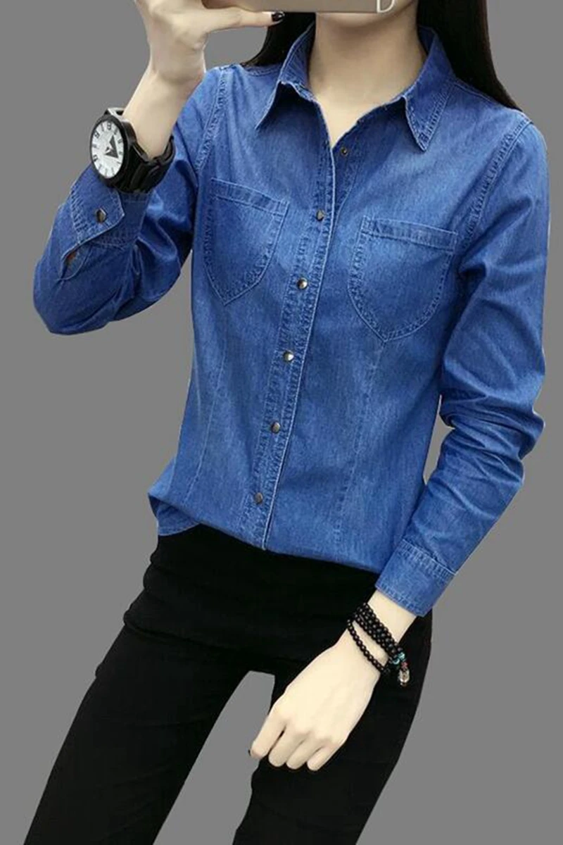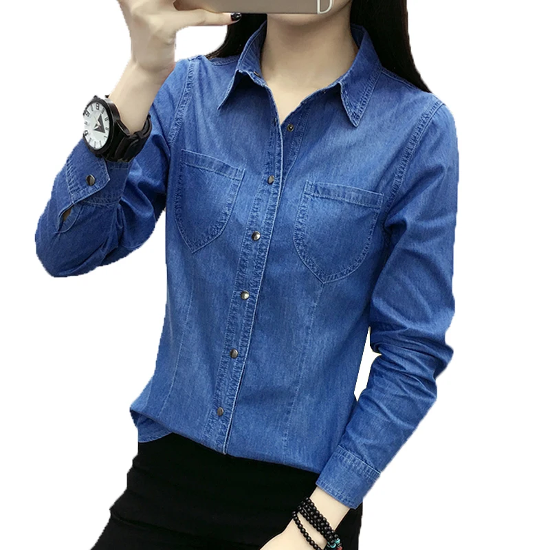 Женская джинсовая рубашка с карманами, модная облегающая блузка с длинным рукавом, женская одежда на весну