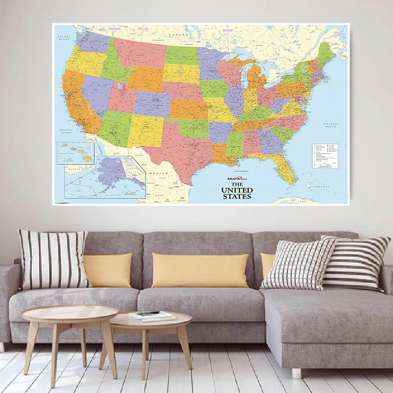 Карта США размером A2, настенный плакат и принты, Картина на холсте, карта Америки, украшение для дома и офиса, школьные принадлежности