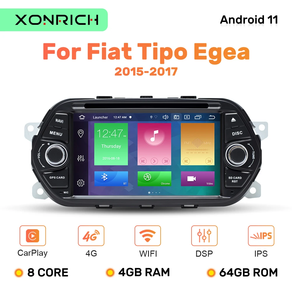 Автомагнитола IPS DSP, 64 ГБ, 1Din, Android 11, DVD для Fiat Tipo Aegea Egea 2015, 2016, 2017, автомобильный мультимедийный плеер, GPS, навигация, стерео