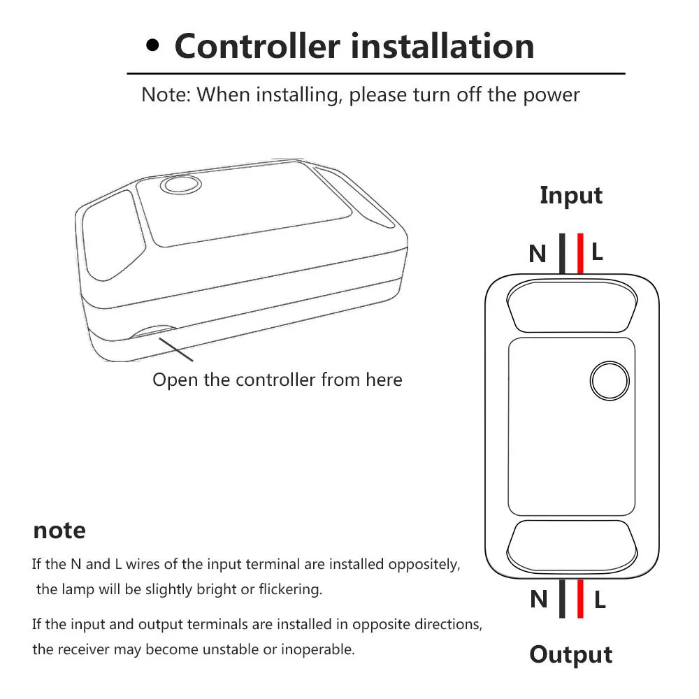 1. При установке выключите питание2. Если Провода N и L входного терминала установлены противоположно, лампа будет слегка яркой или мерцающей.3. Если входные и выходные клеммы установлены в противоположных направлениях,Приемник может стать нестабильным или неработоспособным.