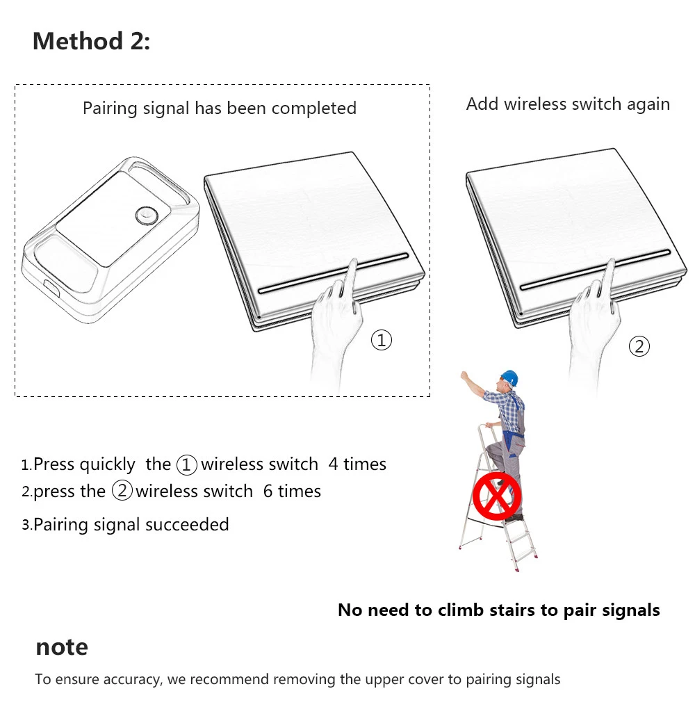 Метод 2: Нет необходимости поднимать по ступенькам для сопряжения сигналов1. Нажмите быстро (1) беспроводной переключатель 4 раза2. Нажмите (2) беспроводной переключатель 6 раз3. Сигнал сопряжения успешноПримечание:1. Обязательное условие: перед началом работы этого шага должен быть сигнал сопряжения между пультом дистанционного управления и контроллером2. Для обеспечения точности рекомендуется снять верхнюю крышку для сопряжения сигналов